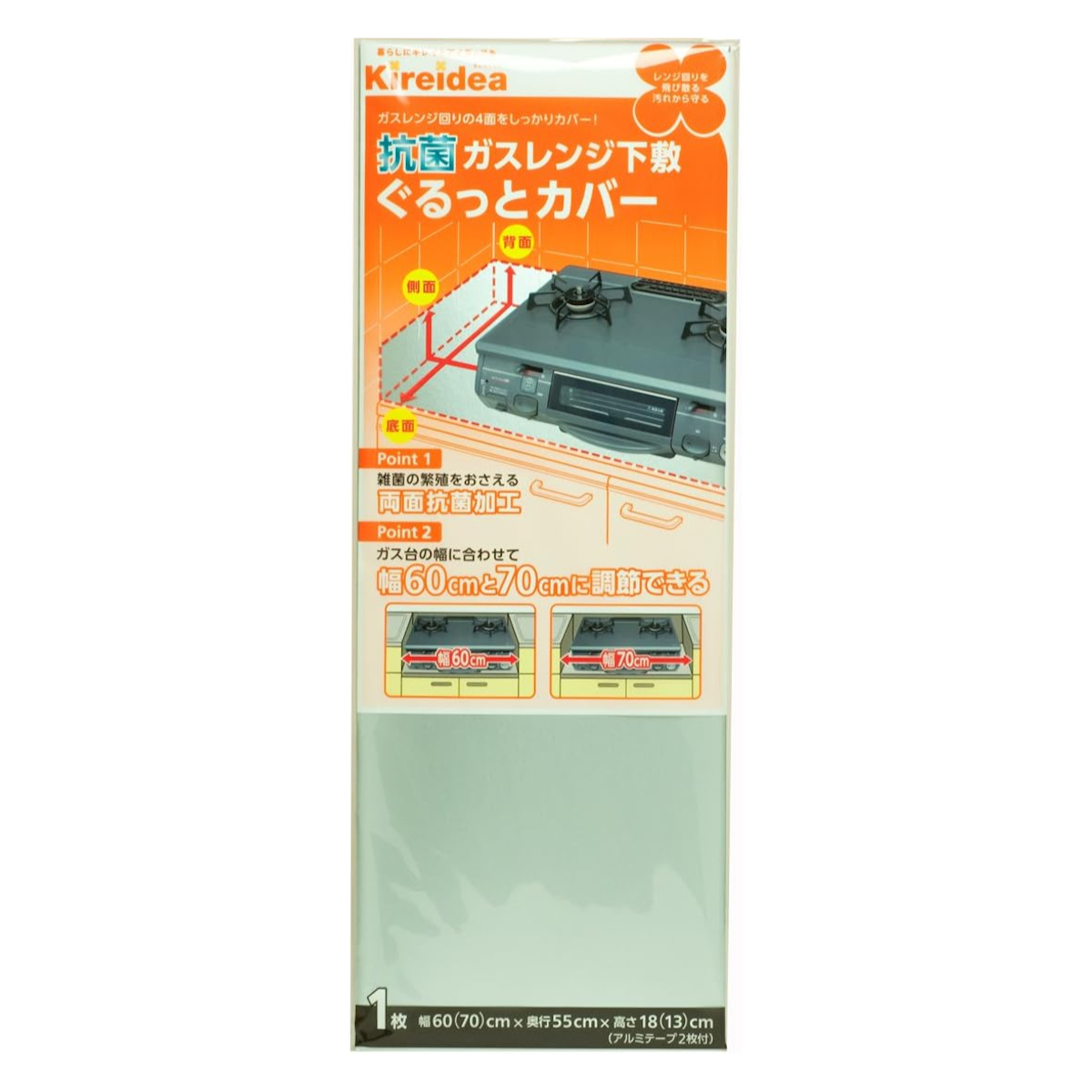 ガスレンジまわりの4面をぐるっとカバーできる、抗菌加工のガスレンジ下敷きです。ガスレンジの下や収納庫の中に敷くことで、焼け焦げや煮汁、油はね等をしっかり受け止め、汚れを防止・雑菌の繁殖を抑えます。