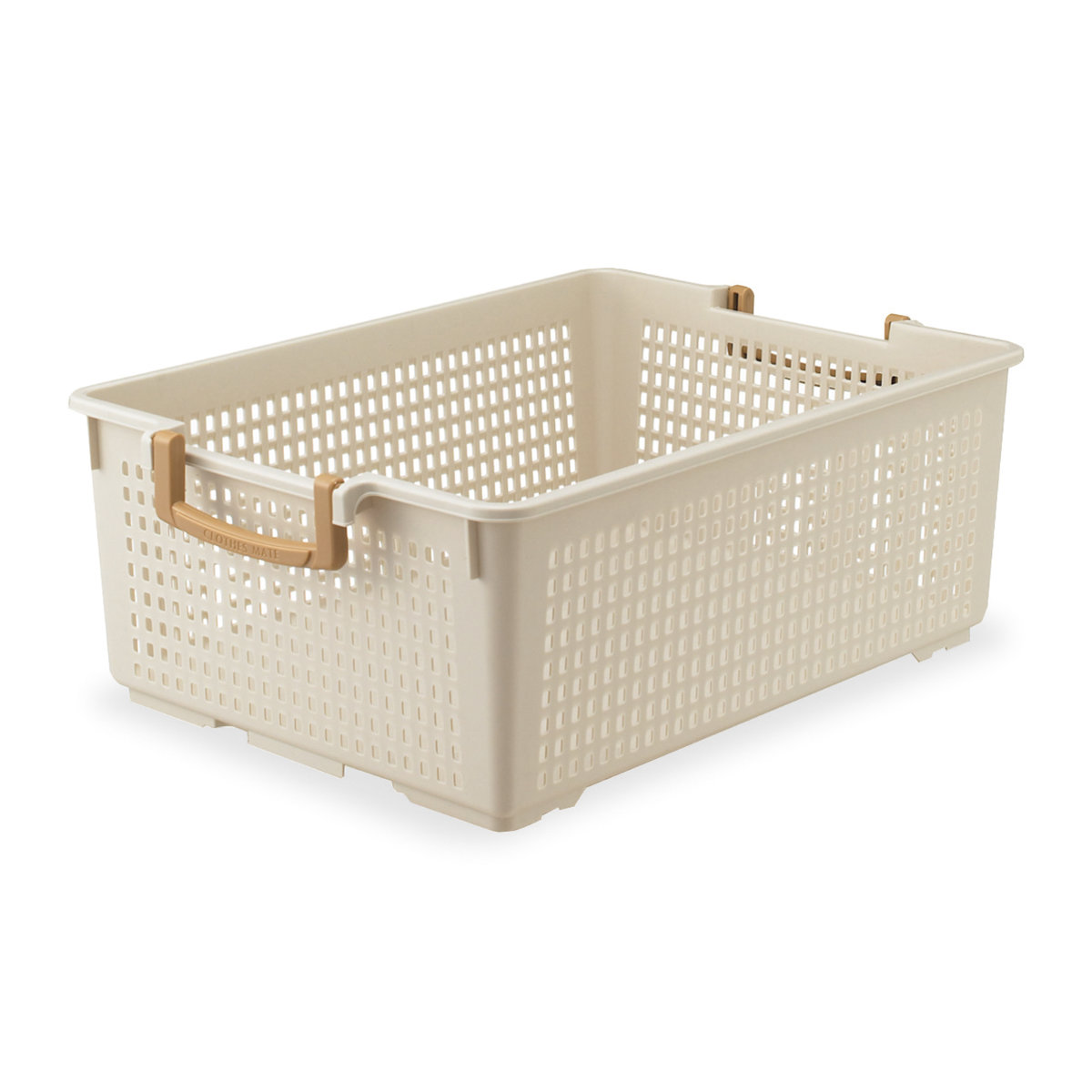 取っ手を内側に倒すと、底にある溝とぴったりフィットして積み重ねることができるバスケットです。積み重ねて使用することで、広いスペースの取れないクローゼットや押入れ、リビングの片隅などで省スペースに整理整頓していただけます。