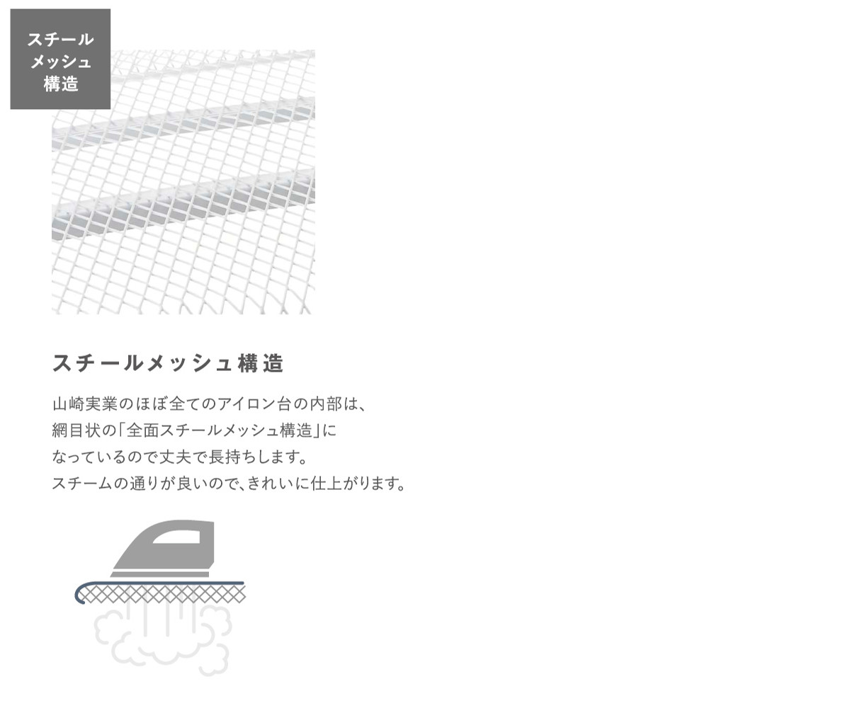 内部は網目状になったスチールメッシュ構造で、スチームの通りがよく、パリッときれいに仕上がります。スチールなので、熱に強く丈夫で長持ちします。