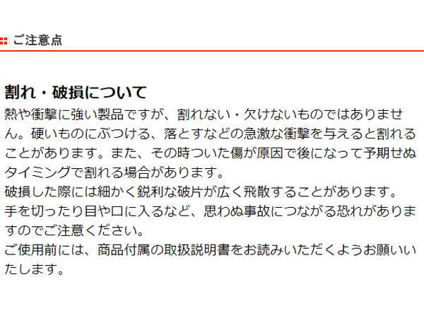 | 注意事項 | ※ガスオーブン不可です ※破損した際には細かく鋭利な破片が広く飛散する恐れがあります |