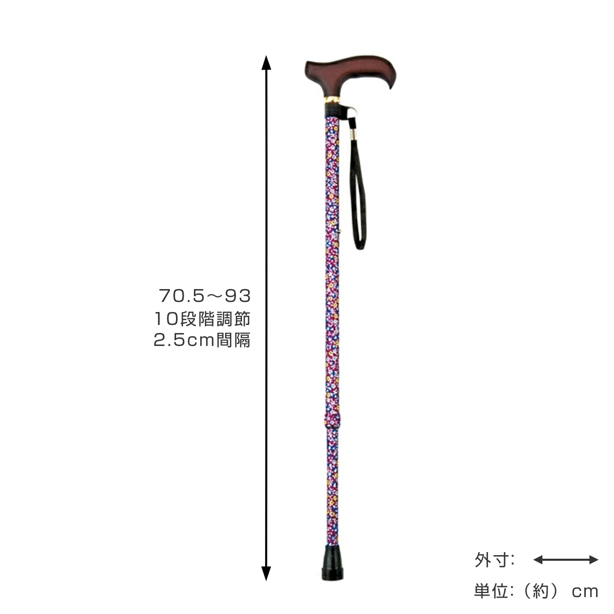 | サイズ | 杖の長さ:約70.5~93cm 伸縮10段階(2.5cm間隔) 杖先ゴム:16mm |