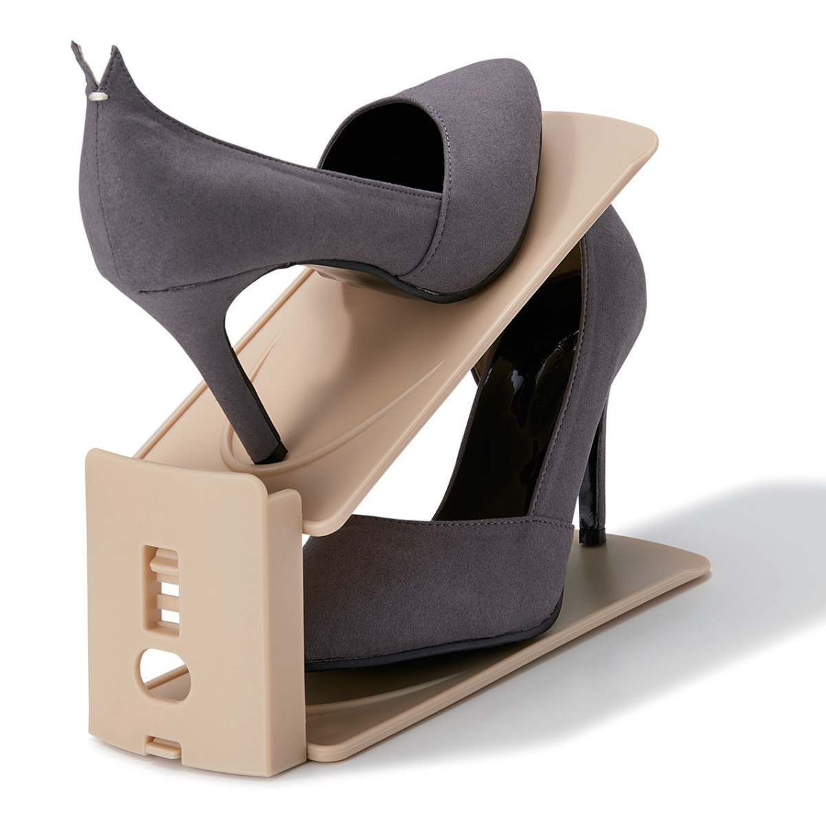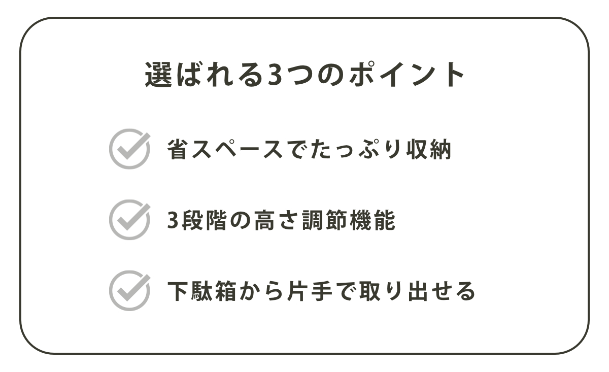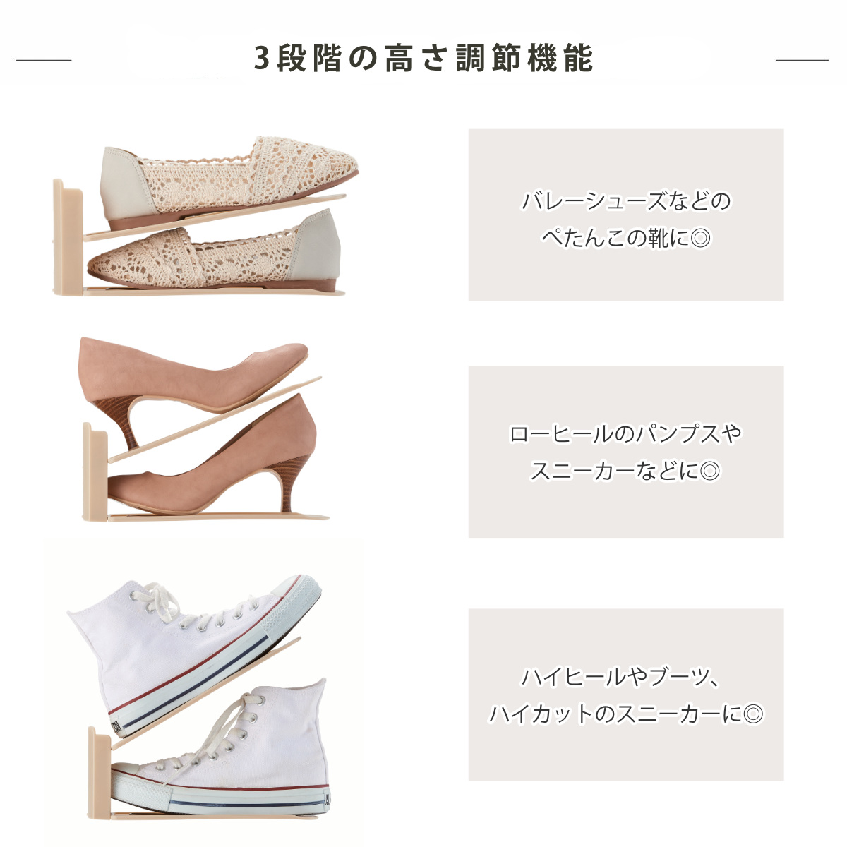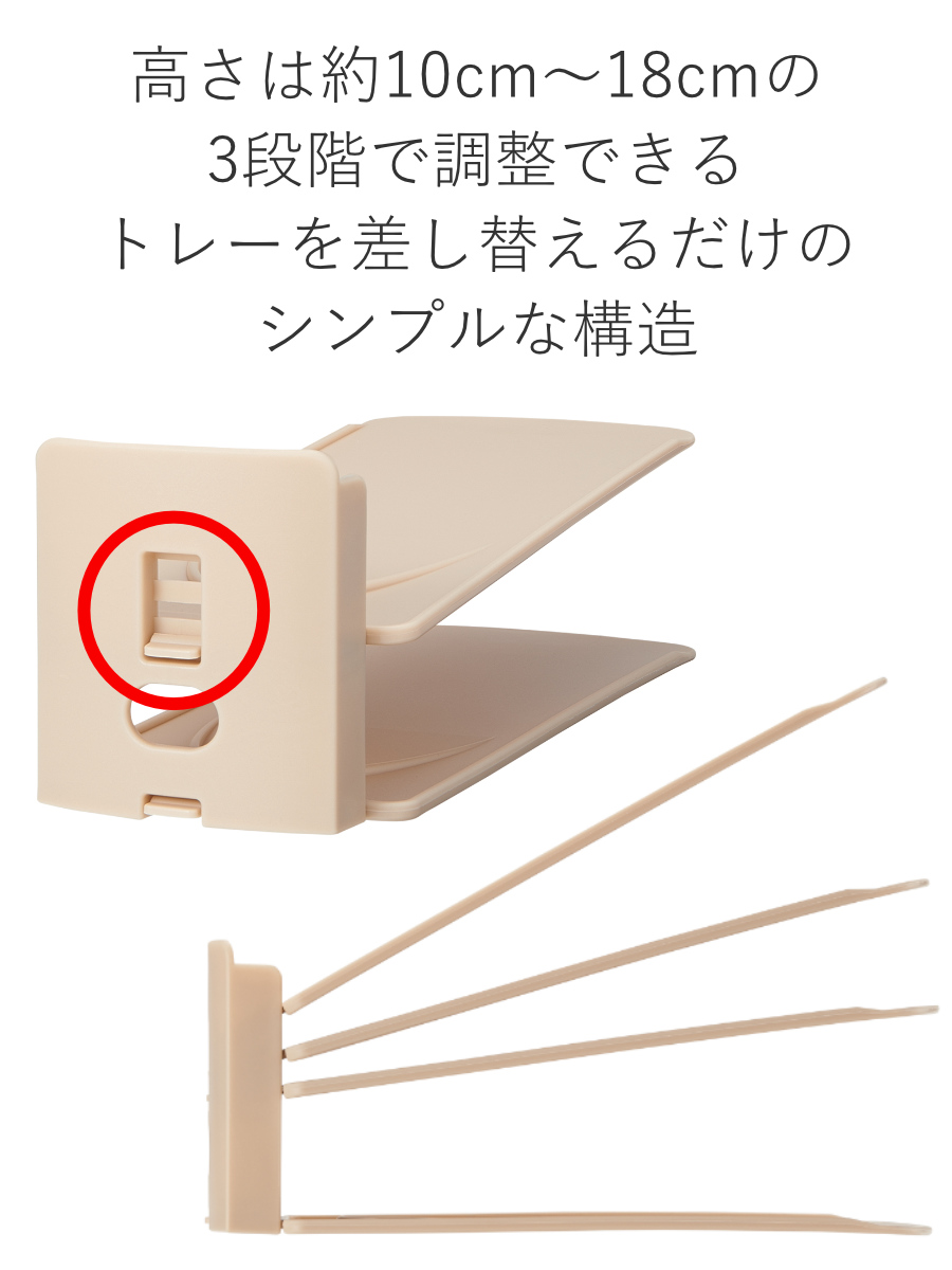 高さは、約10cm~18cmの3段階で調整できます。トレーを差し替えるだけのシンプルな構造です。ぺたんこ靴からお洒落なハイヒール、ハイカットのスニーカーまで様々な高さの靴を無理なく収納できます。