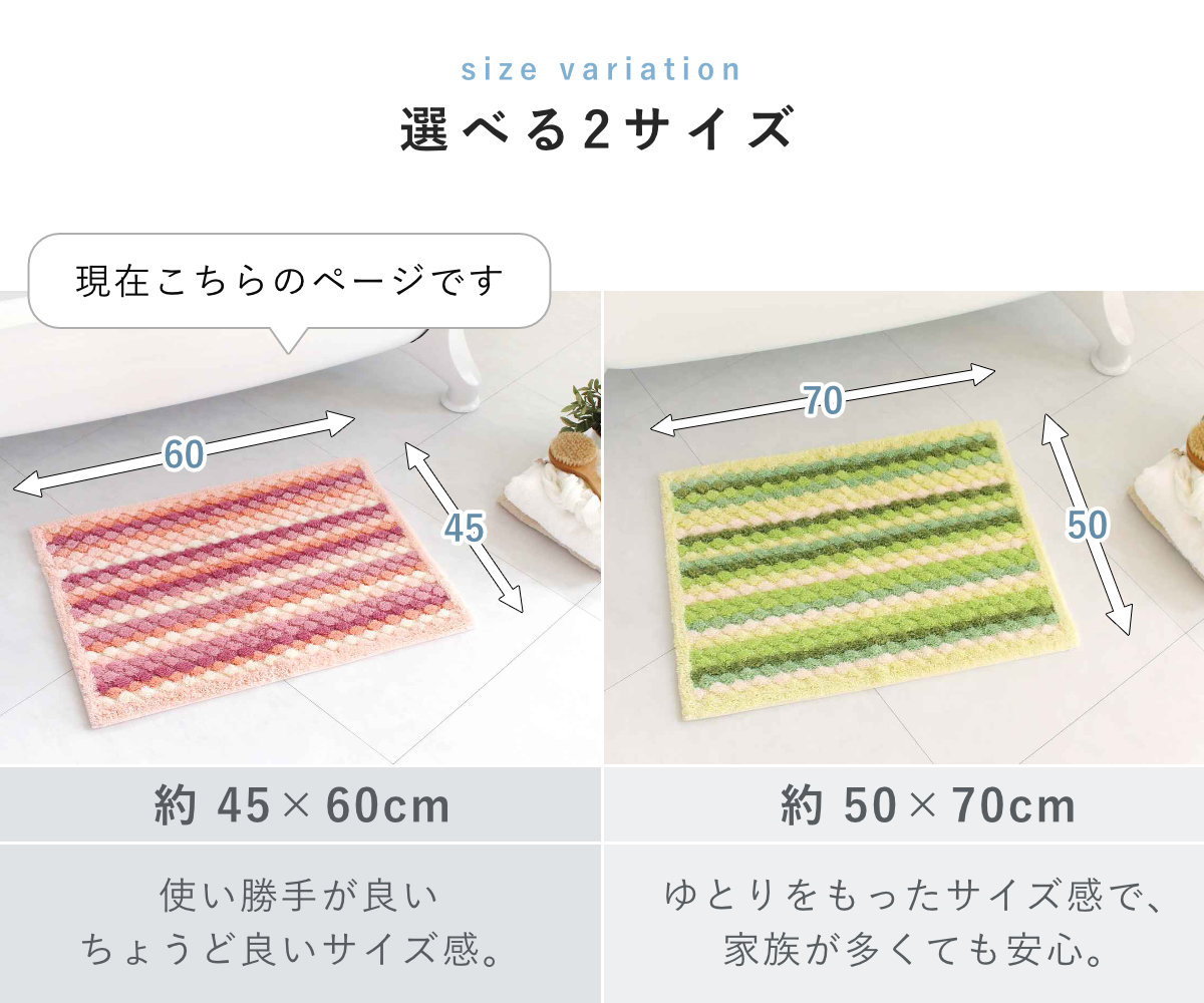 洗っても効果が続く抗菌防臭加工付きで、マット上の菌の増殖を抑制するので、いつまでも衛生的にお使いいただけます。