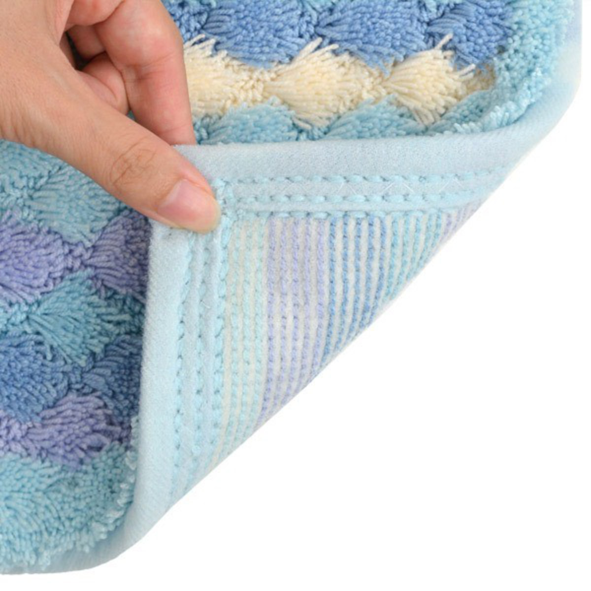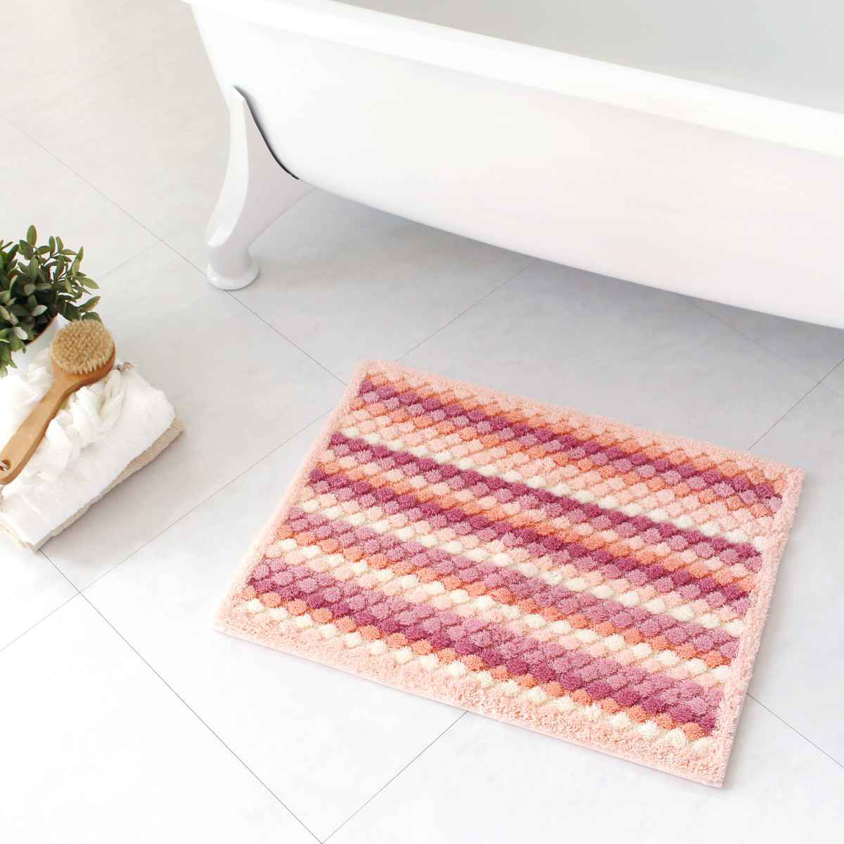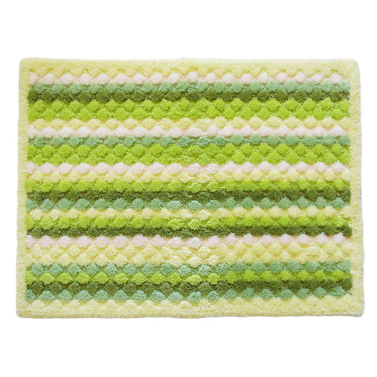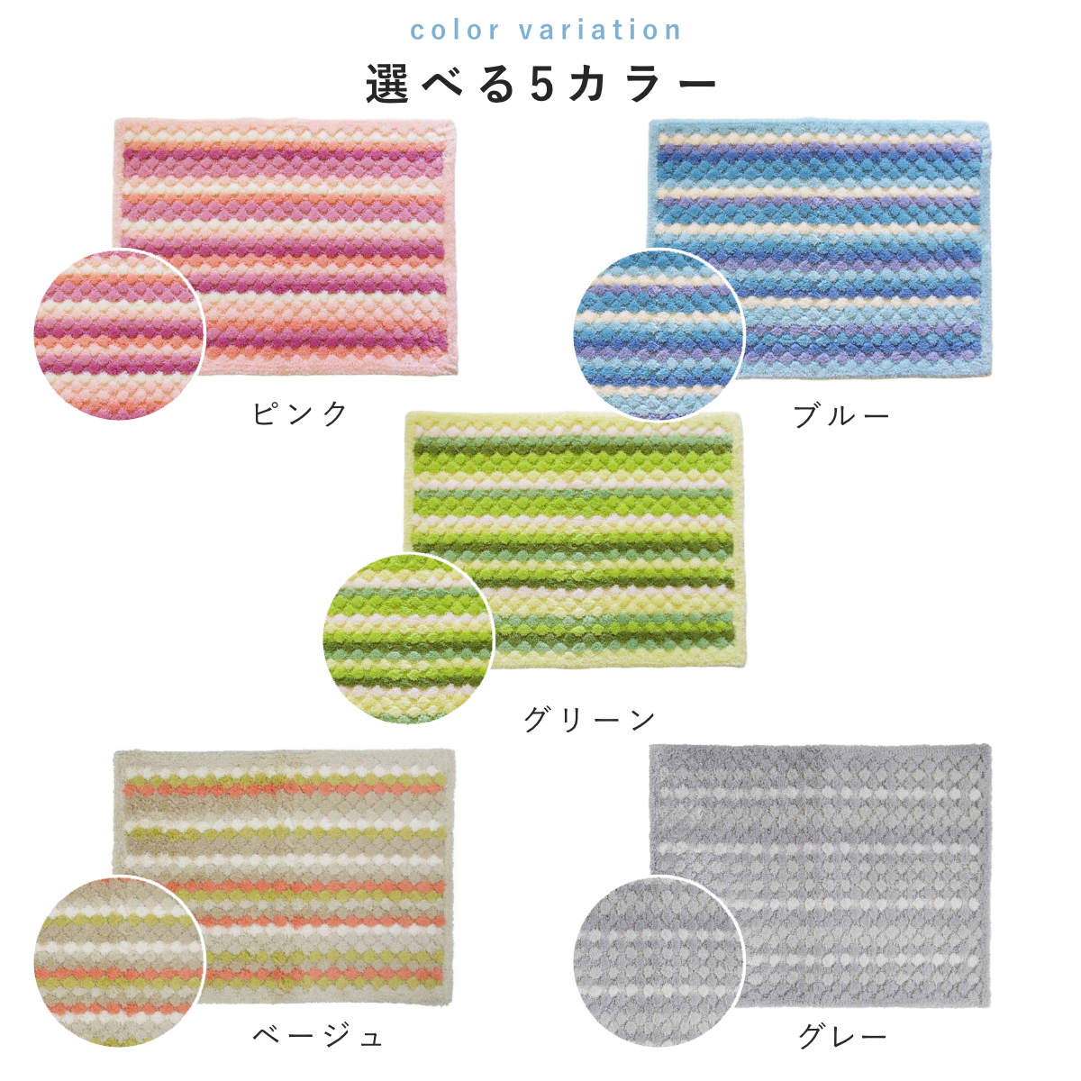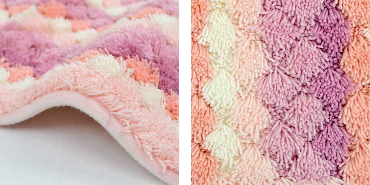 毛足の先がカットされたものと、ループ状になっている毛足の2種類からできており、毛足の長短によりポコポコとしたテクスチャをつくりました。このデコボコが足裏に気持よくお風呂上がりをより快適にしてくれます。