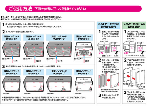 | 備考 | 金属フィルターやフィルター用フレームがついていないタイプには取付けできません。 |