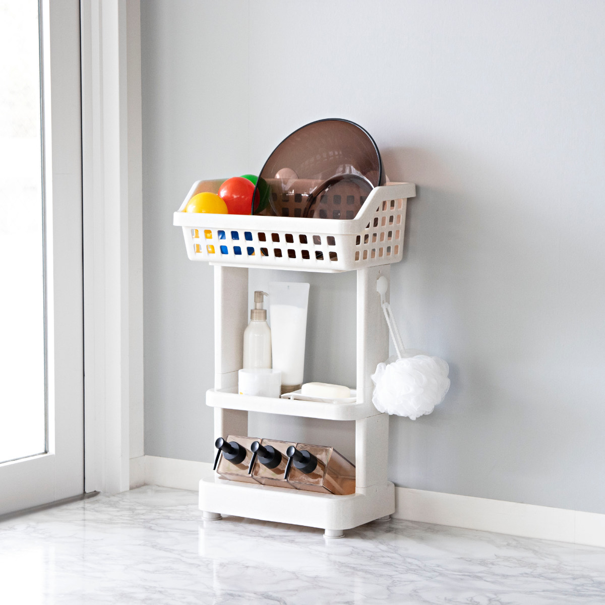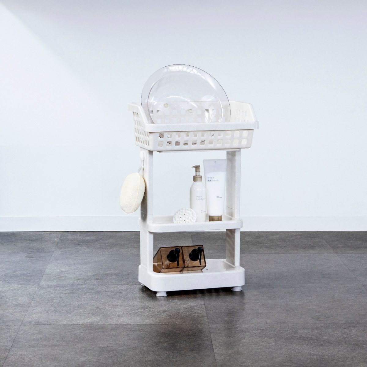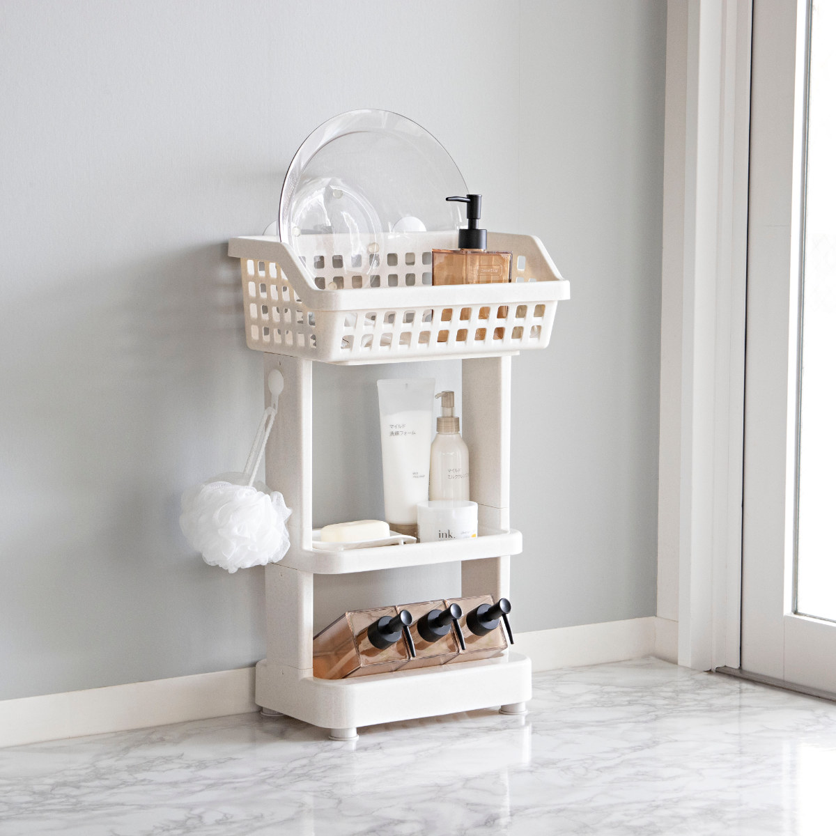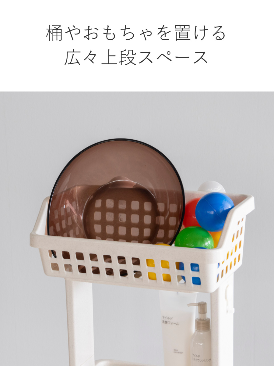 上段は広めのバスケット形状になっており、洗面器やお風呂用のおもちゃなどをまとめて収納できます。水切れのよい形状なので、濡れたまま置いても乾きやすく、バスルームを清潔に保てます。