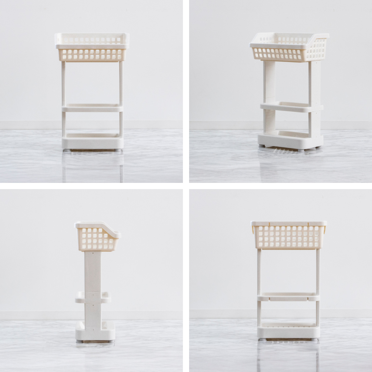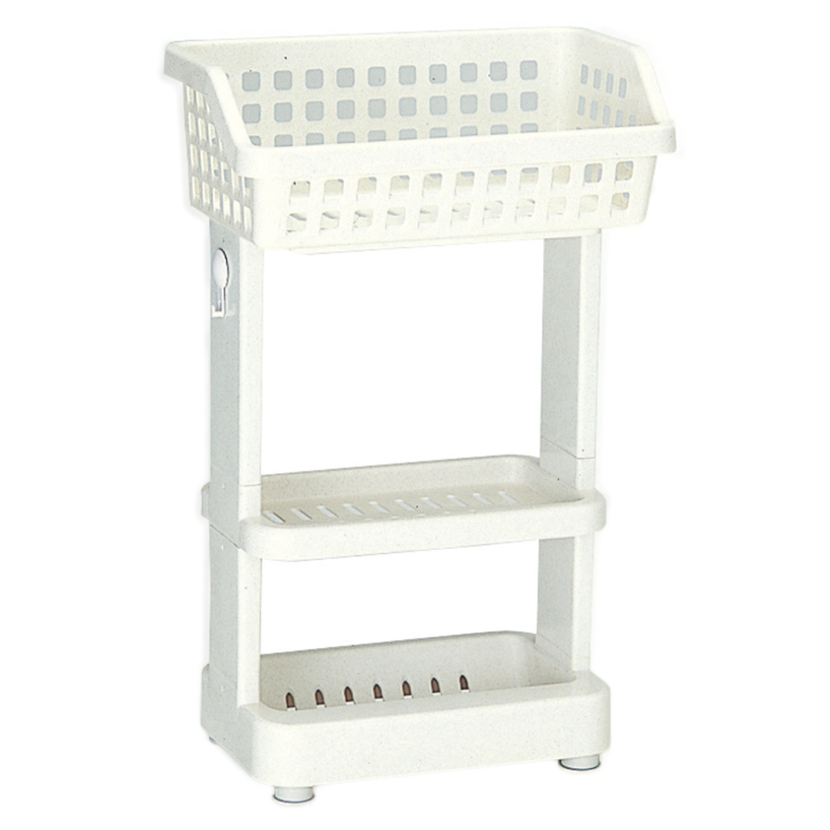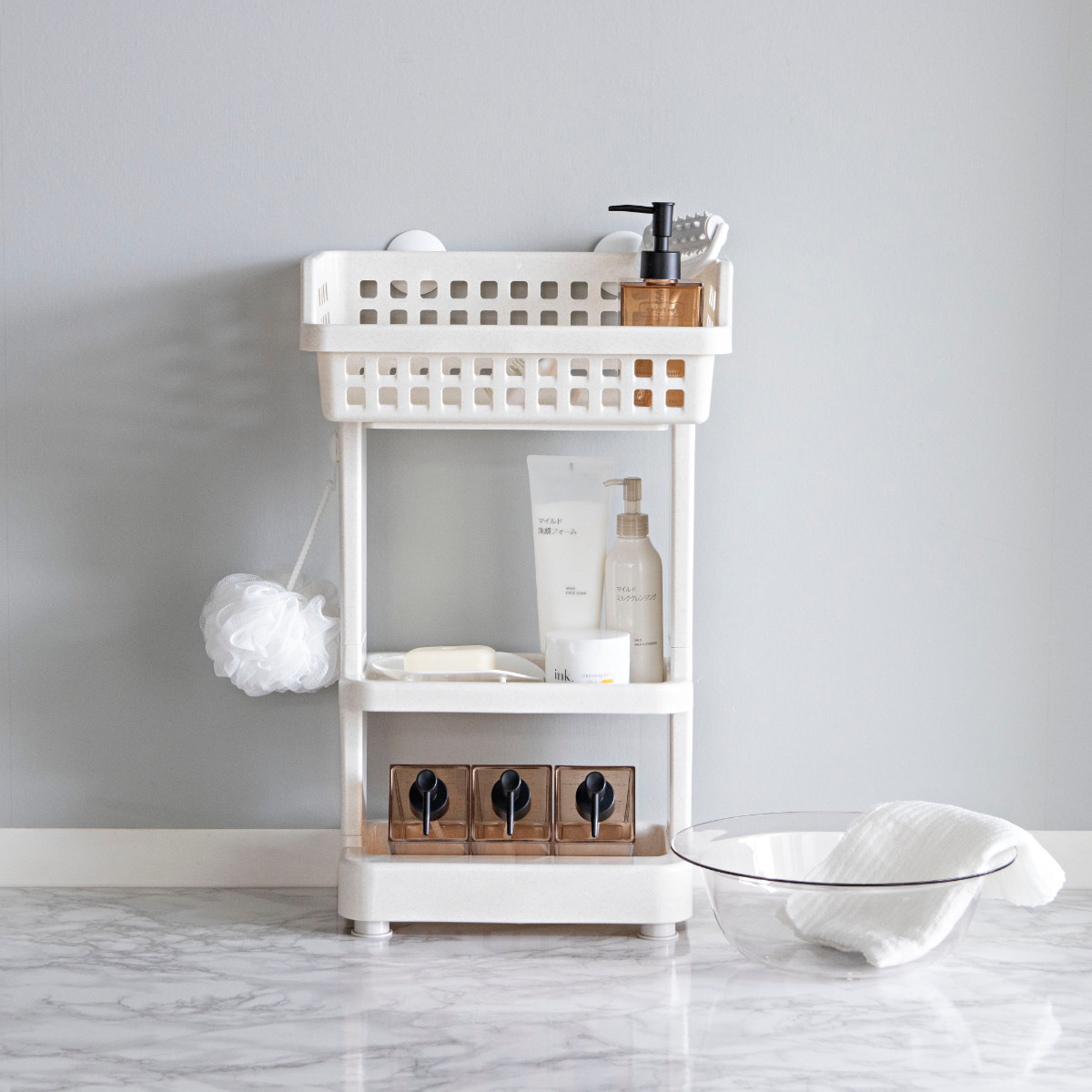 上段は広めのバスケット形状になっており、洗面器やお風呂用のおもちゃなどをまとめて収納できます。水切れのよい形状なので、濡れたまま置いても乾きやすく、バスルームを清潔に保てます。