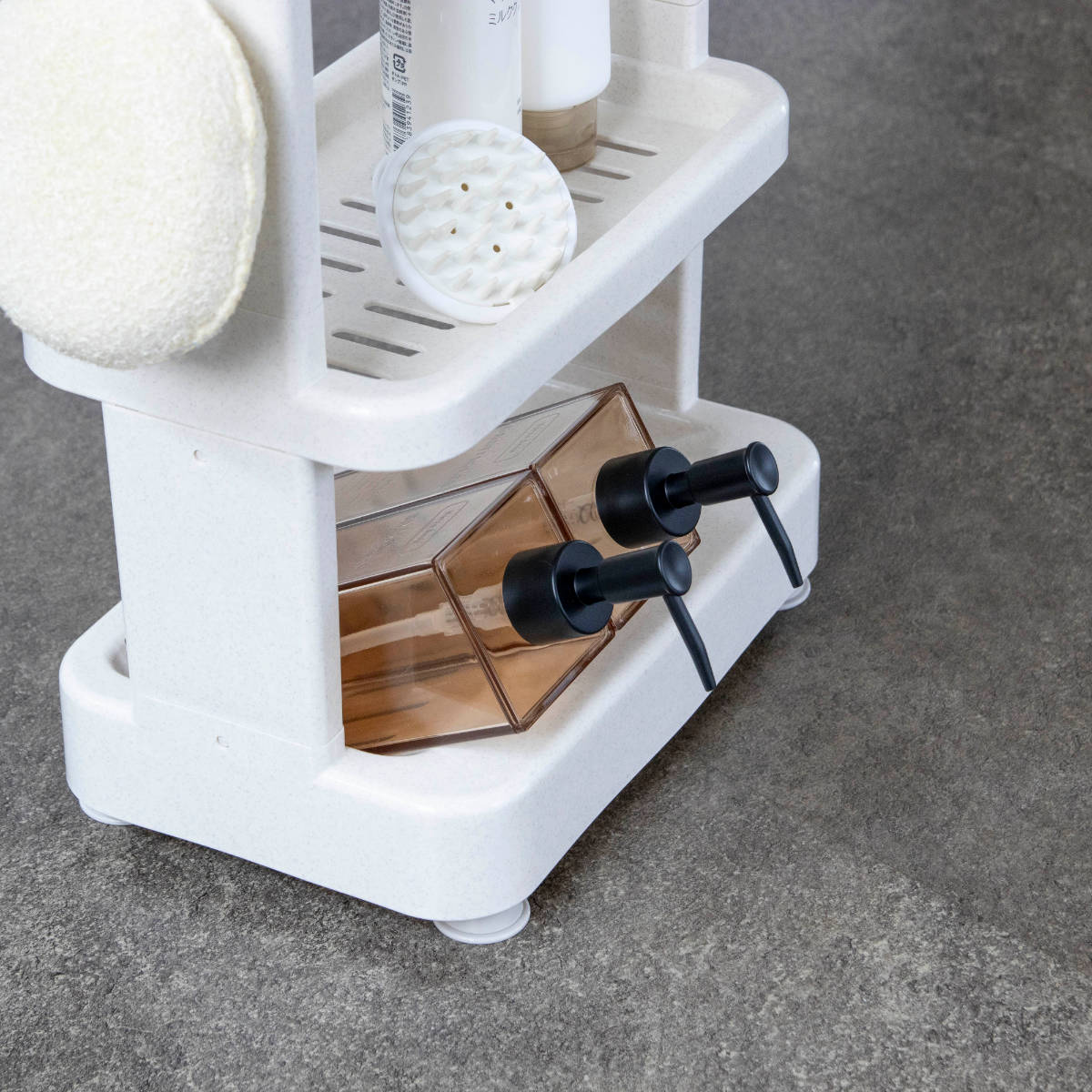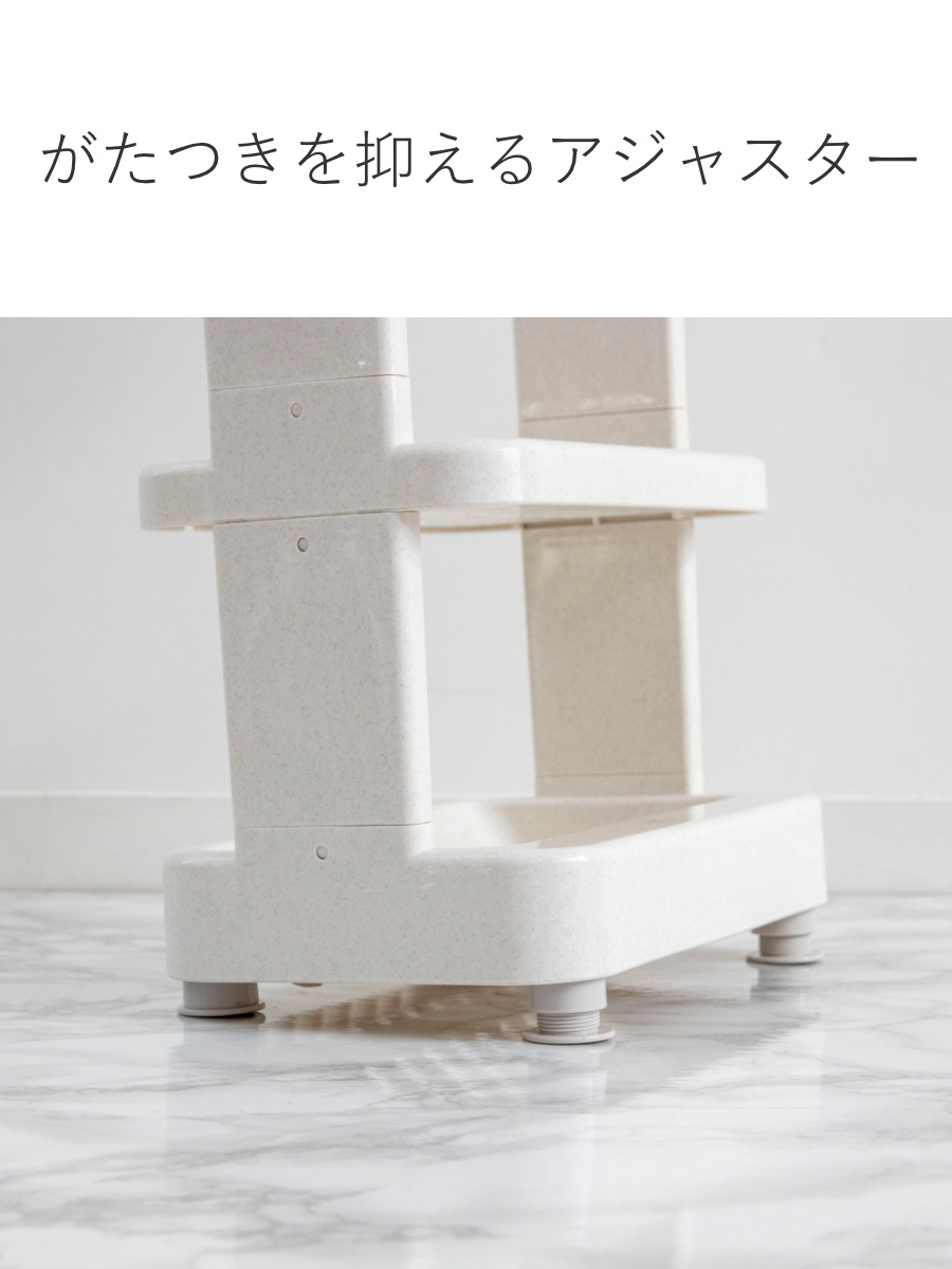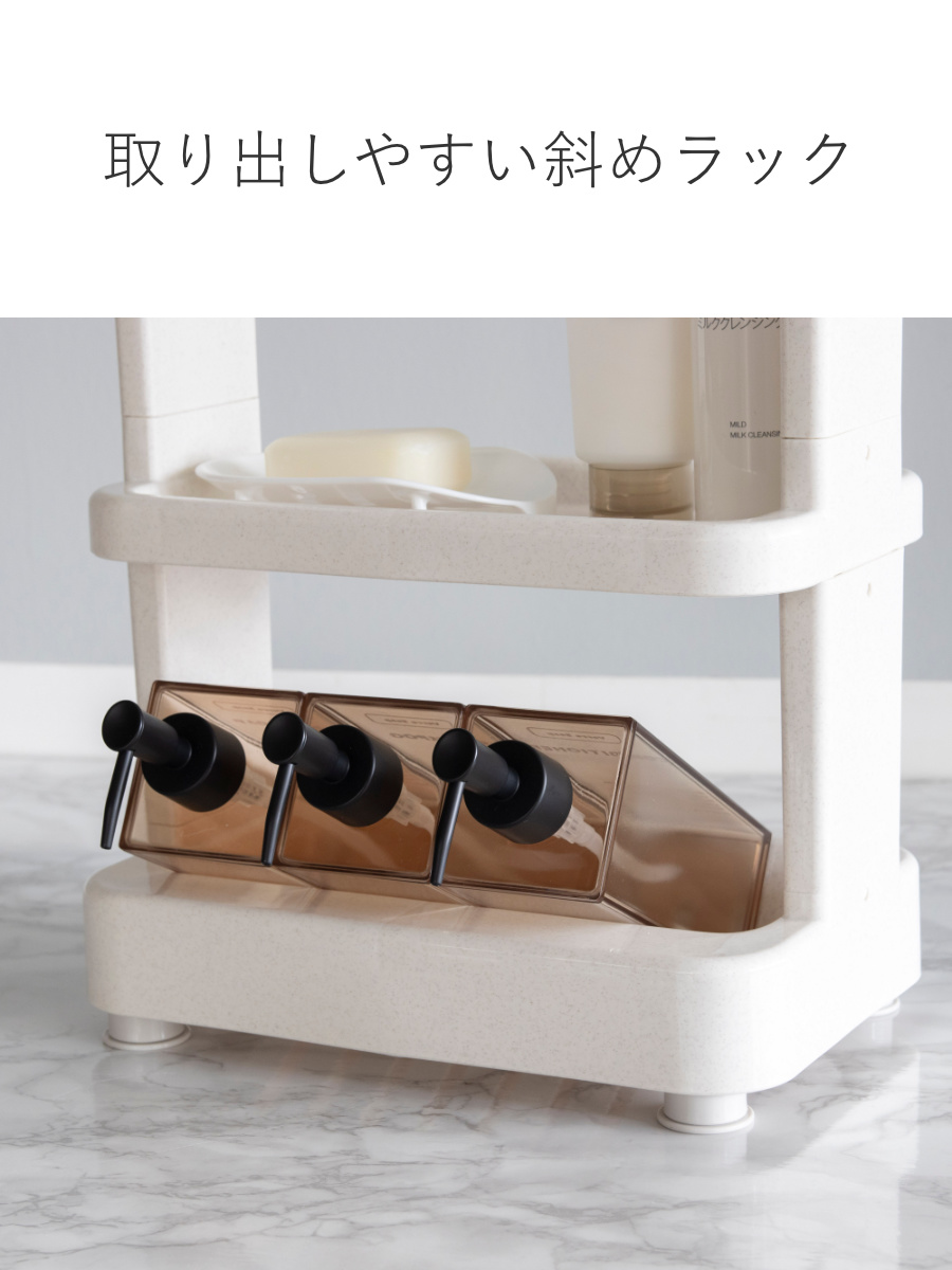 ラック部分は少し前に傾いた設計になっており、シャンプーやボトル類が取り出しやすいのがポイント。使うたびに手を伸ばしやすく、快適にお使いいただけます。