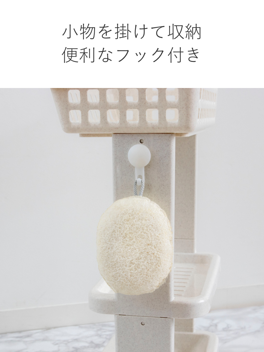 側面にはフックが付いており、泡立てネットやスポンジなどの小物を掛けて収納できます。浮かせて収納できるので水切れがよく、衛生的にお使いいただけます。