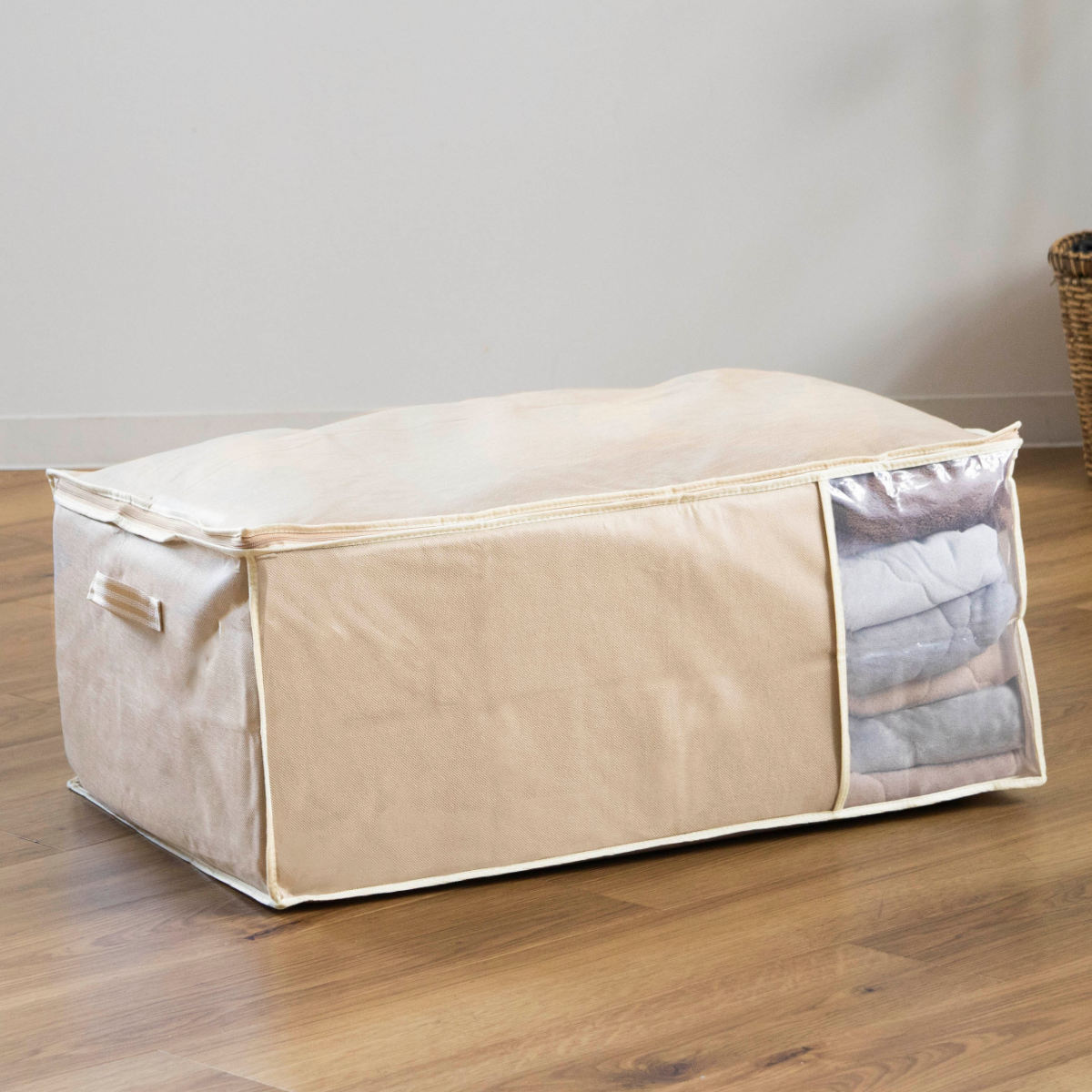 毛布や敷パッドの収納にピッタリな収納袋です。不織布のやわらかい生地で収納物をやさしく守り、ホコリやゴミをしっかりガード。清潔に保ちながら大切に収納できます。