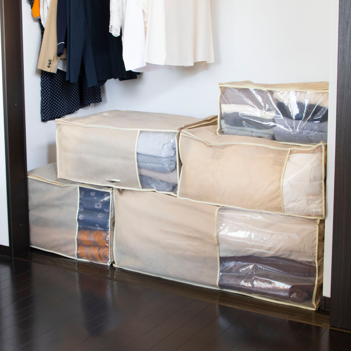 押入れやクローゼットの棚上にも収納しやすいサイズです。布団や衣類用など豊富なサイズ展開があり、複数揃えて収納すると見た目もスッキリ整います。