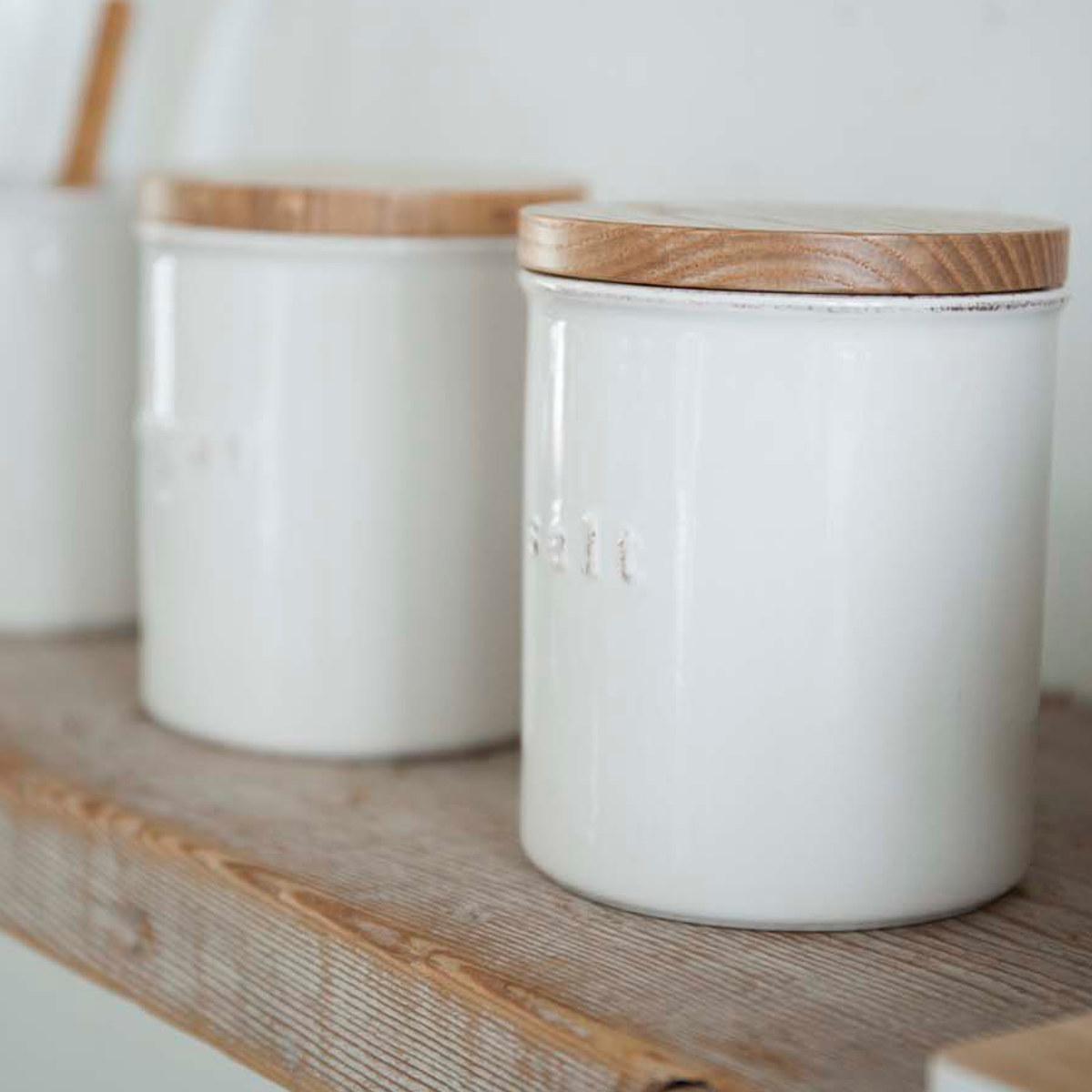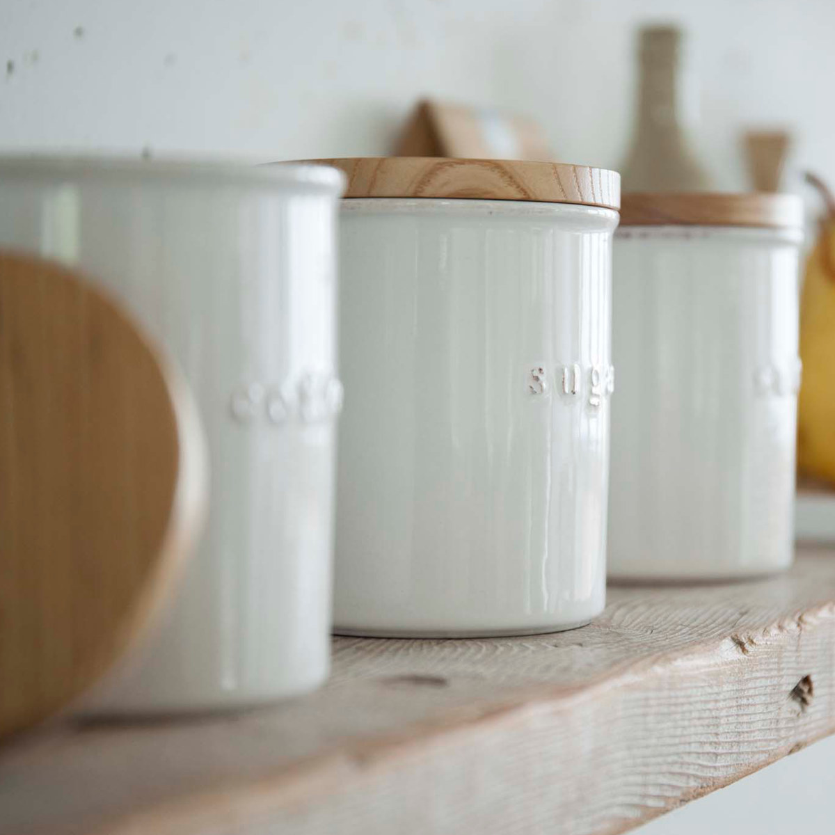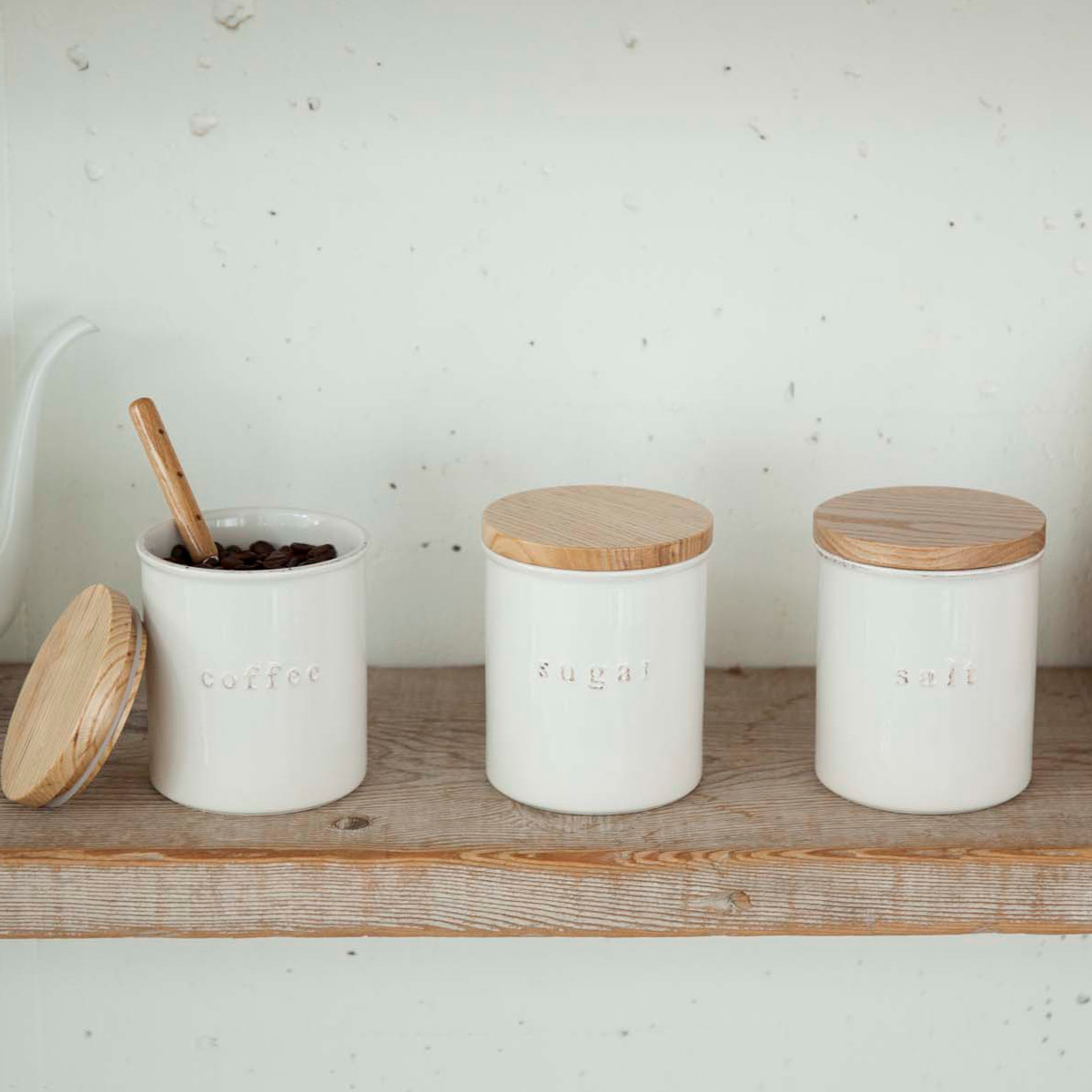 木目が際立った蓋、少しかすれたようなヴィンテージ加工が施された陶器製の本体が、カフェのようなオシャレなキッチンを実現します。いつもなら隠してしまいたい物も、飾っておきたくなるような可愛らしさです。調味料や食品を入れることはもちろん、小物入れとしてダイニングやリビングで棚やテーブルに置いてもステキですね。