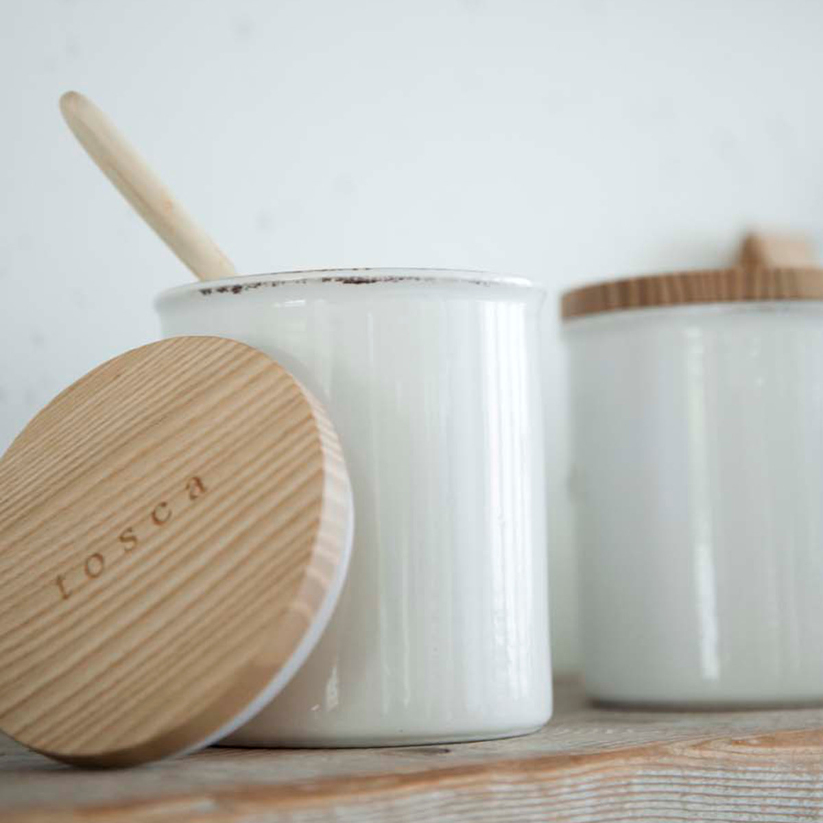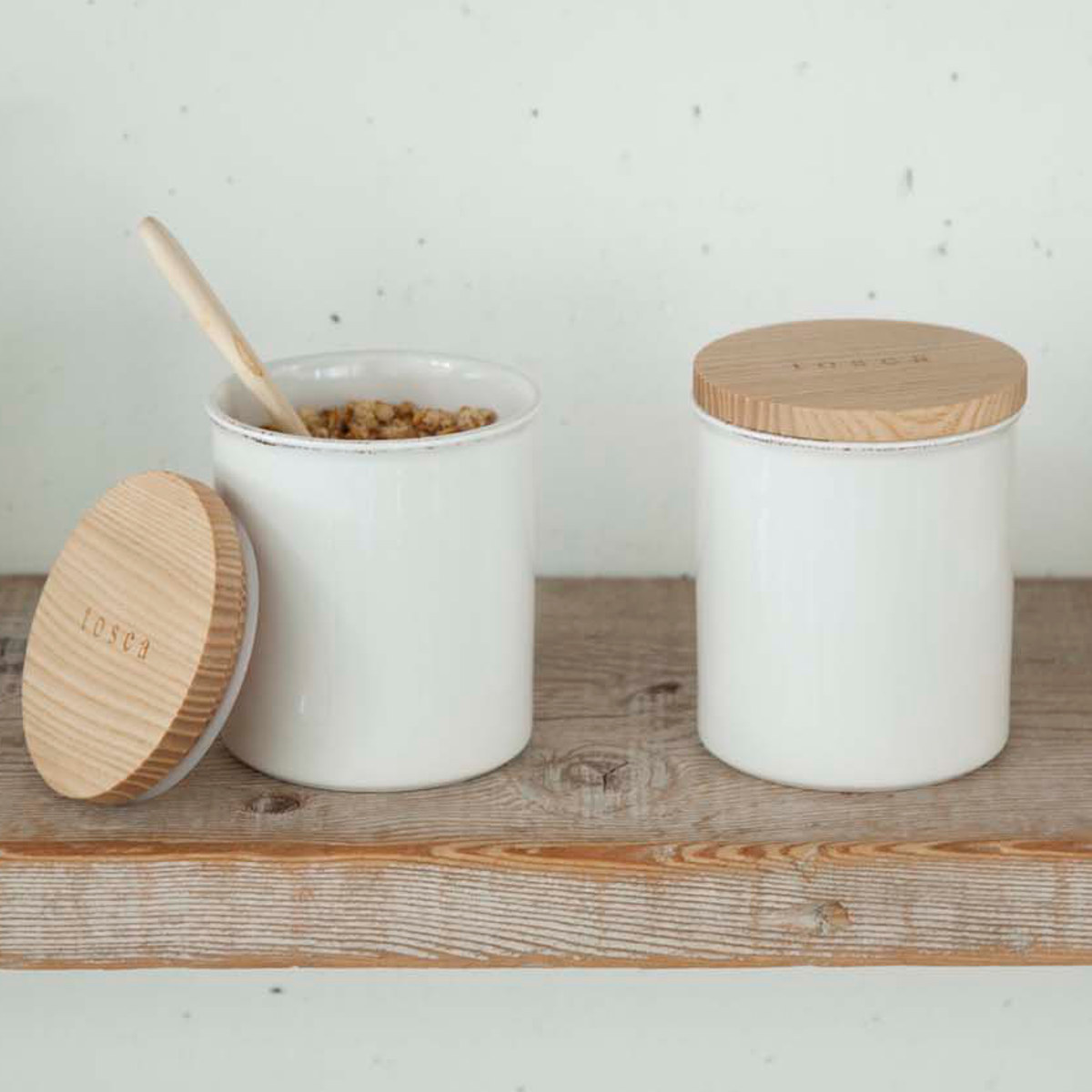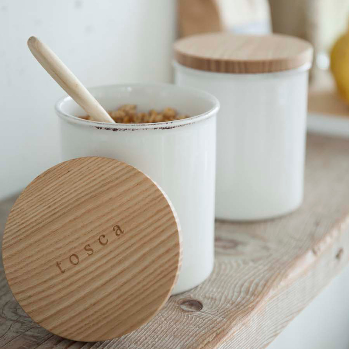 木目が際立った蓋、少しかすれたようなヴィンテージ加工が施された陶器製の本体が、カフェのようなオシャレなキッチンを実現します。いつもなら隠してしまいたい物も、飾っておきたくなるような可愛らしさです。調味料や食品を入れることはもちろん、小物入れとしてダイニングやリビングで棚やテーブルに置いてもステキですね。