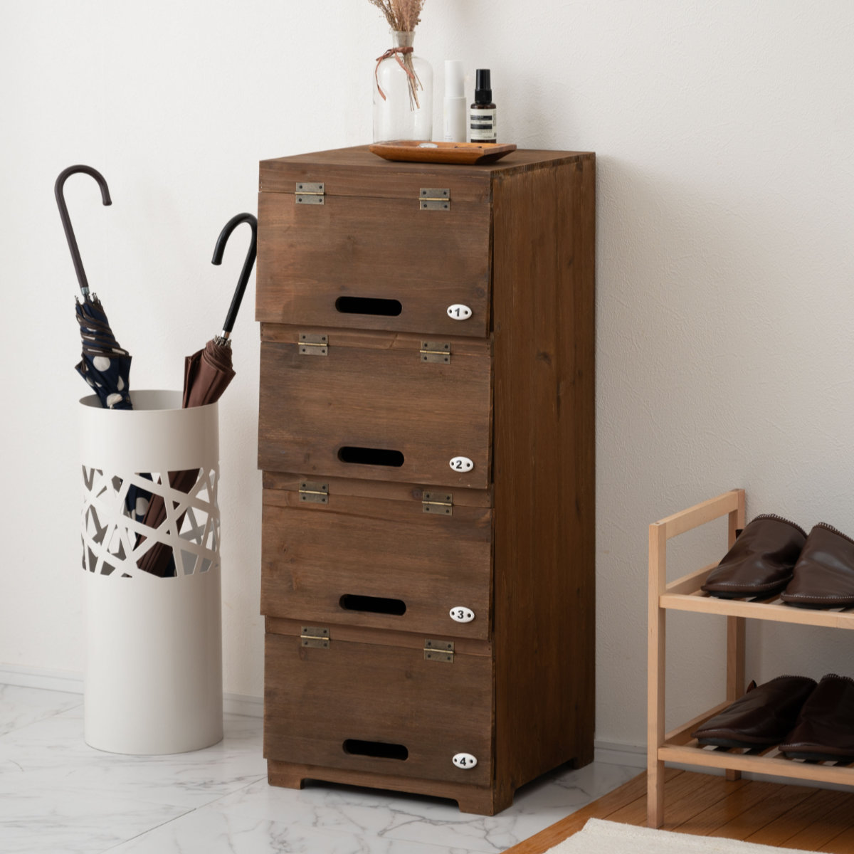 扉を上に持ち上げて開けるタイプのシューズラックです。玄関では靴をすっきり隠してお洒落に収納でき、室内ではさっとしまえて美しく見せる4段キャビネットとしてご使用いただけます。