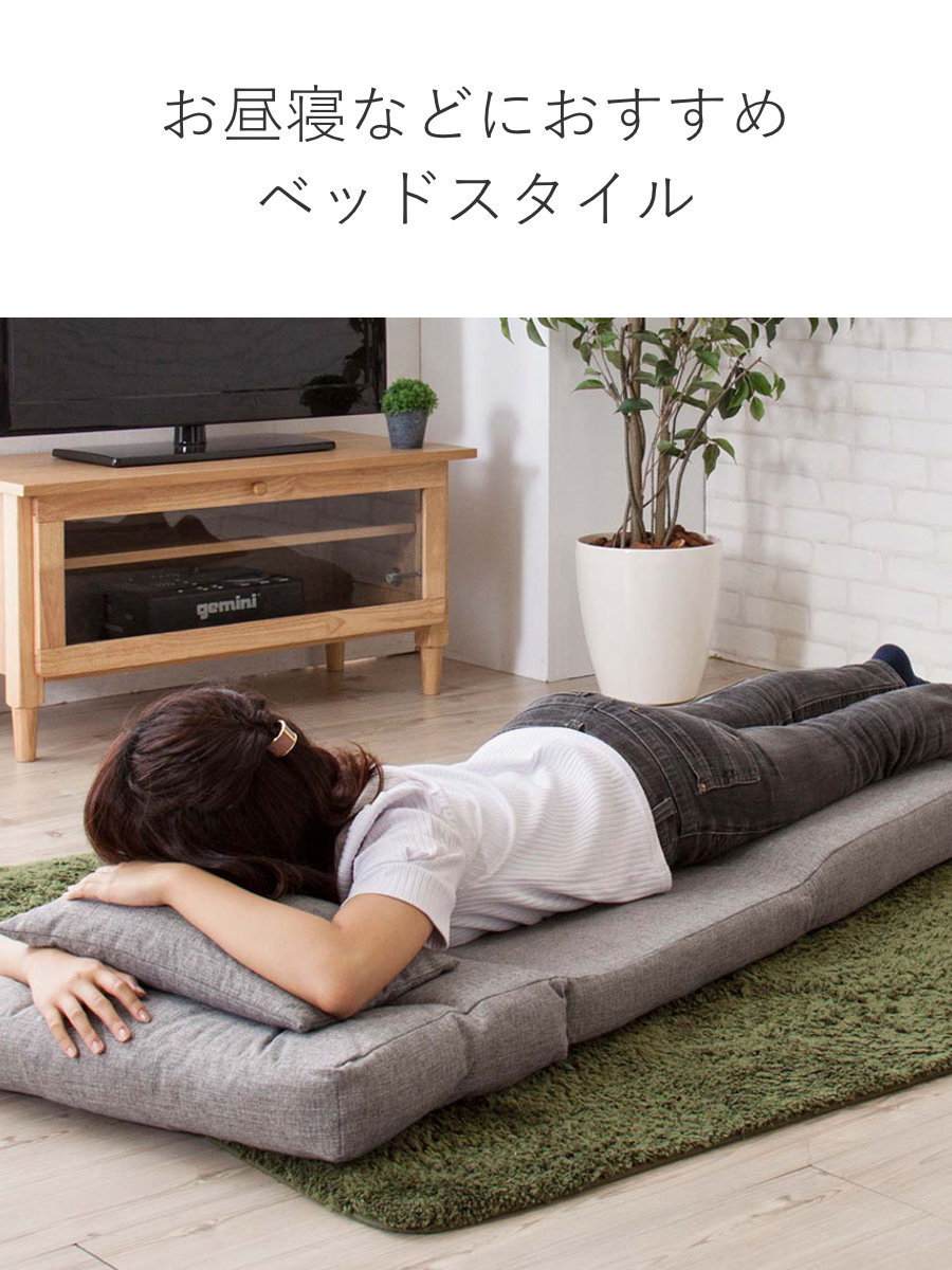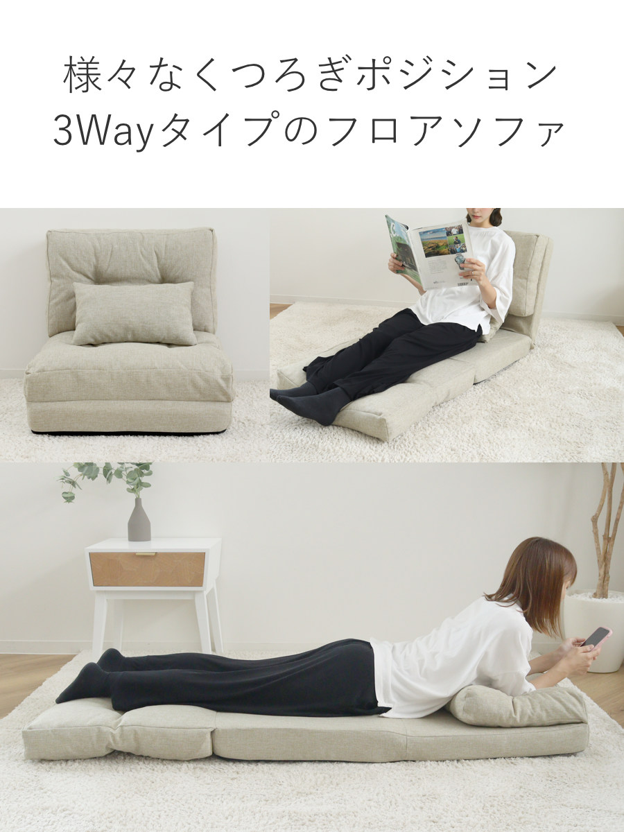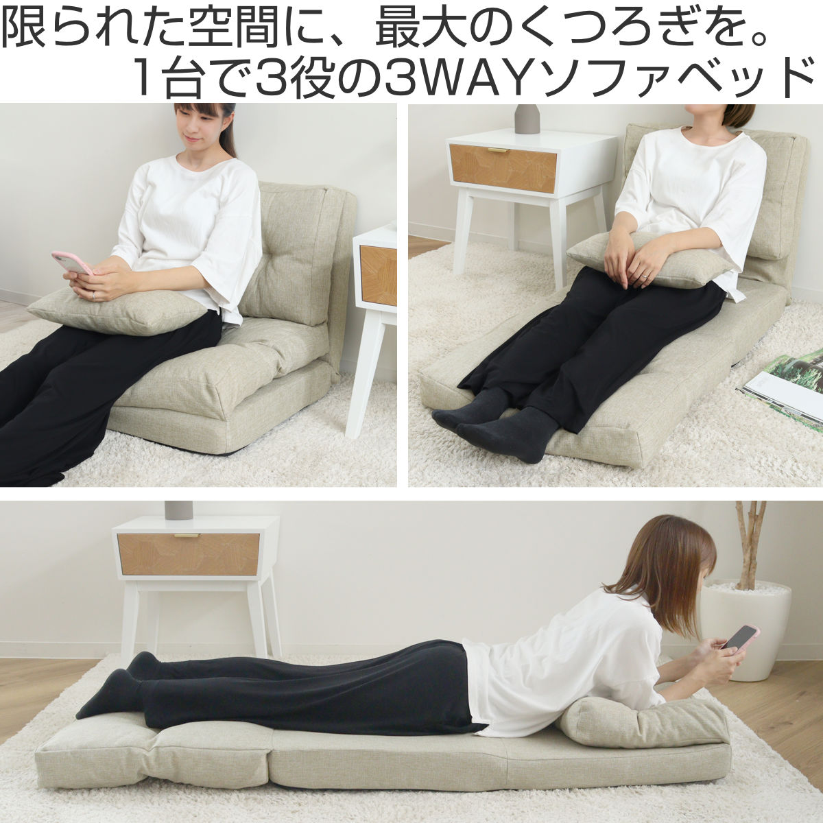 ソファ・カウチ・ベッドスタイルと3つのスタイルが楽しめるロータイプのソファーベッドです。幅60cmの1人掛けにちょうどいいサイズです。背もたれの角度も変えられるので、お好みのスタイルでリラックスして過ごせます。