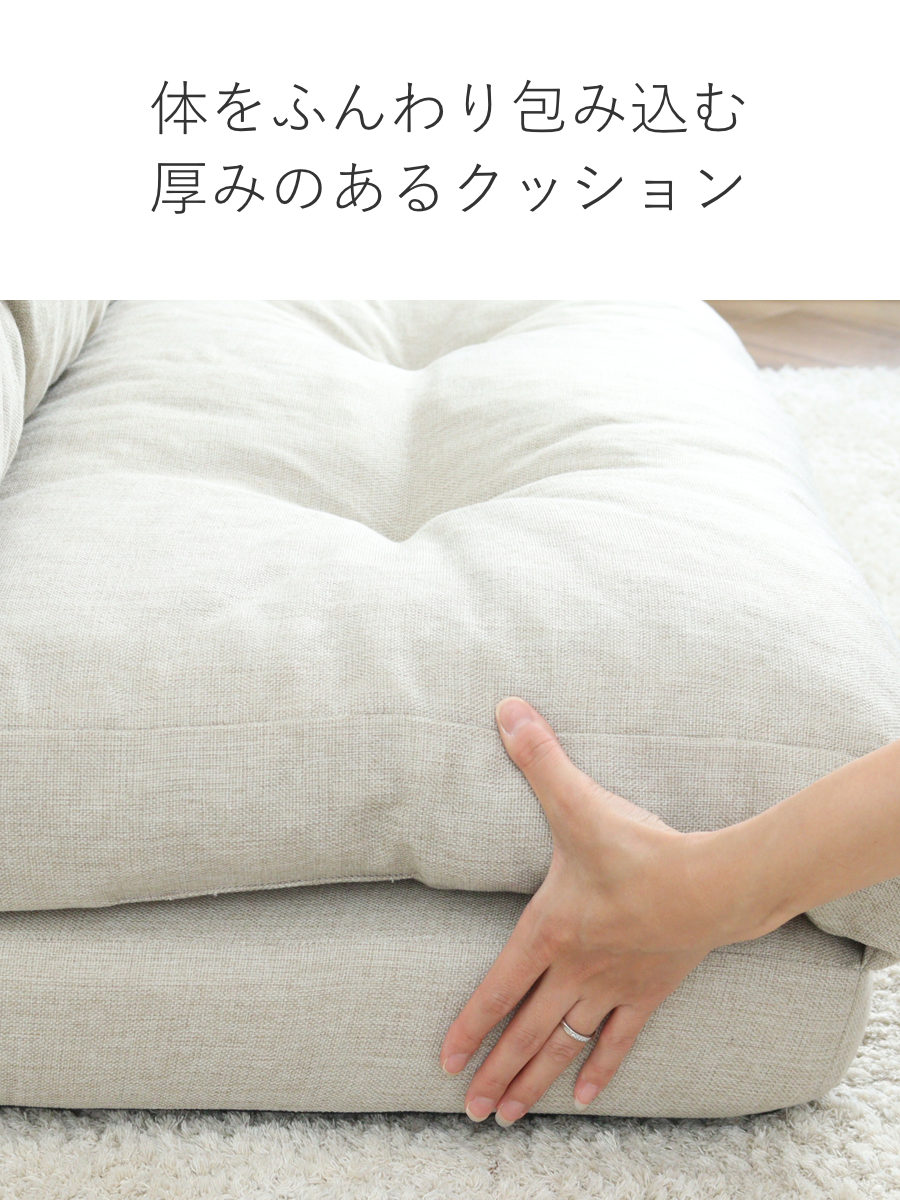 背もたれを広げてリクライニングを倒せば、長さ約197cmのベッドスタイルになります。全体的にしっかりとした厚みがあるため、底付き感もなくゆったりと休めます。来客用の簡易ベッドとしてもおすすめです。