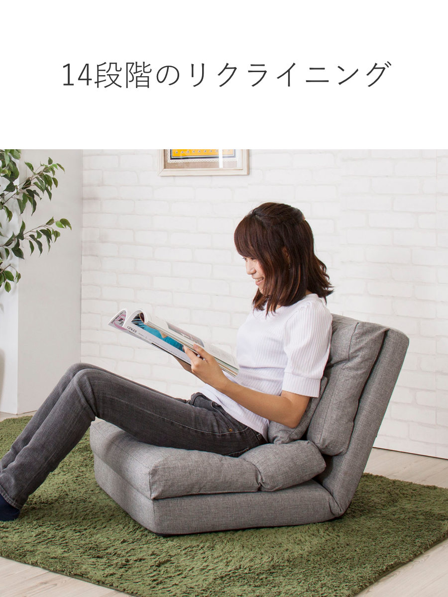座面を広げると足元ひろびろのカウチソファに様変わり。背もたれの角度を細かく調節できるので、読書や映画鑑賞などさまざまなシーンで使えます。