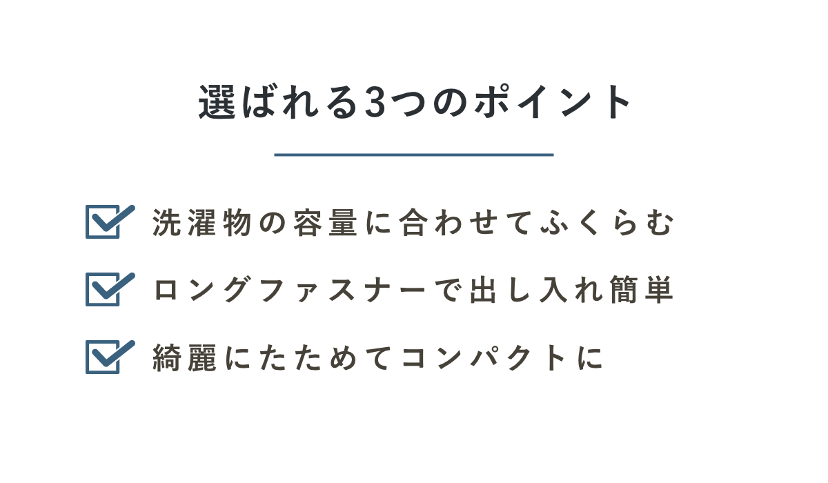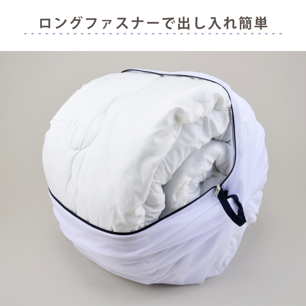 大きく開くロングファスナーで、かさばる寝具の出し入れがスムーズにできます。開け閉めしやすく、毎日の洗濯が快適です。