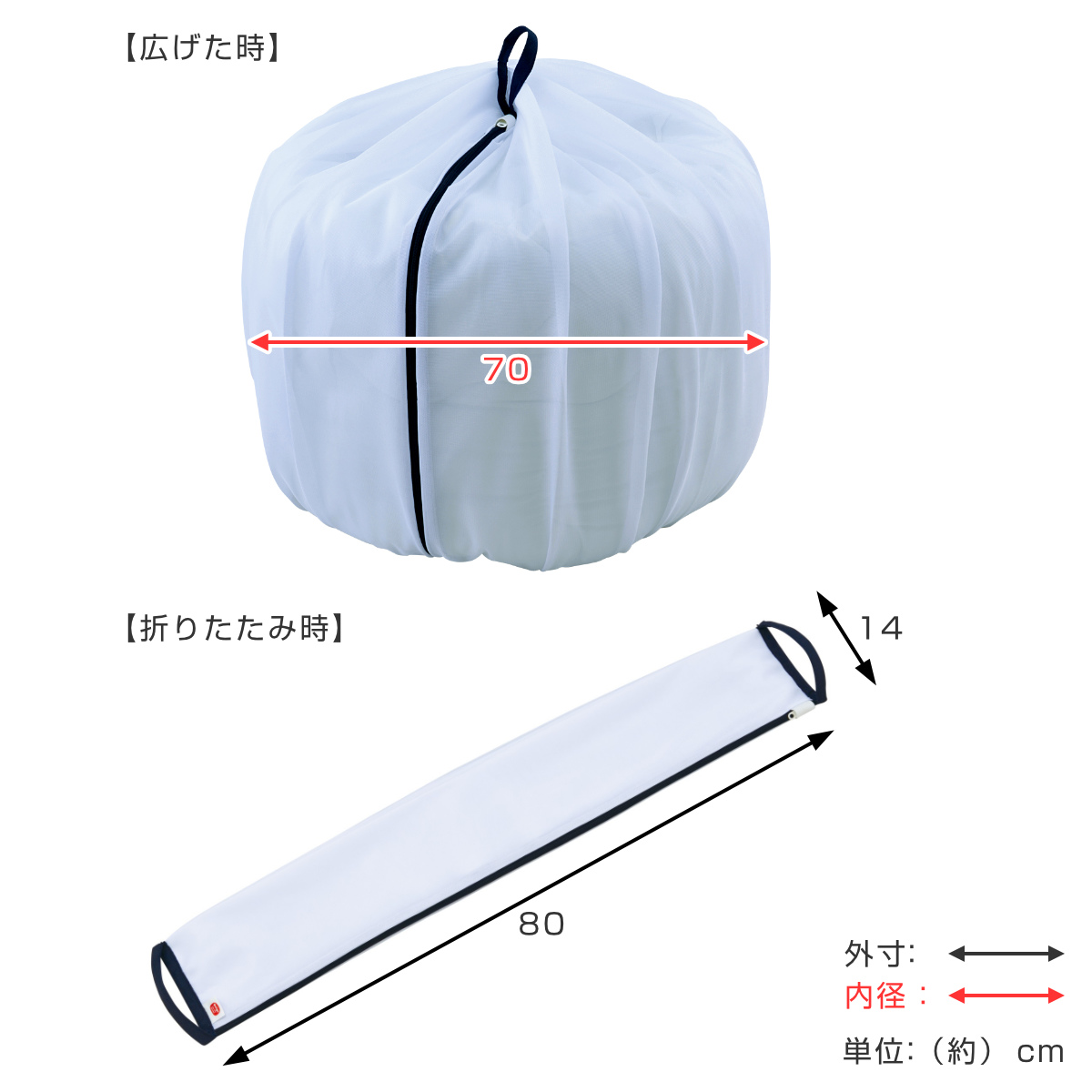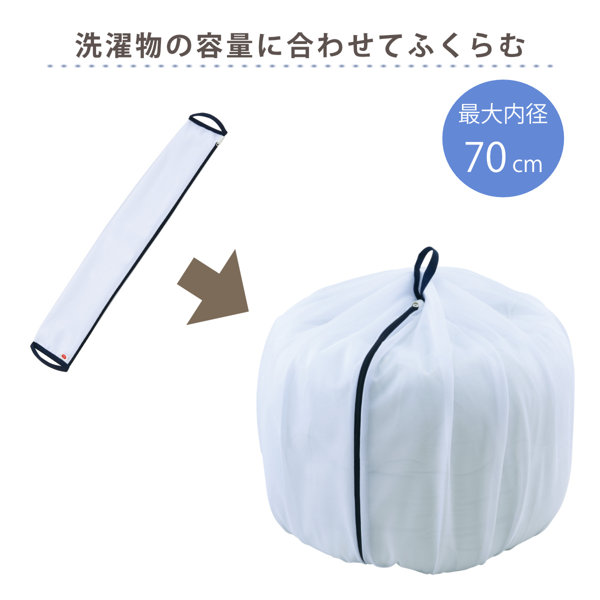 毛布などの大きな寝具もゆったり入る大容量サイズです。洗濯物の量に合わせて自然にふくらむので、シングル毛布から衣類や小物のまとめ洗いまで幅広く使えます。