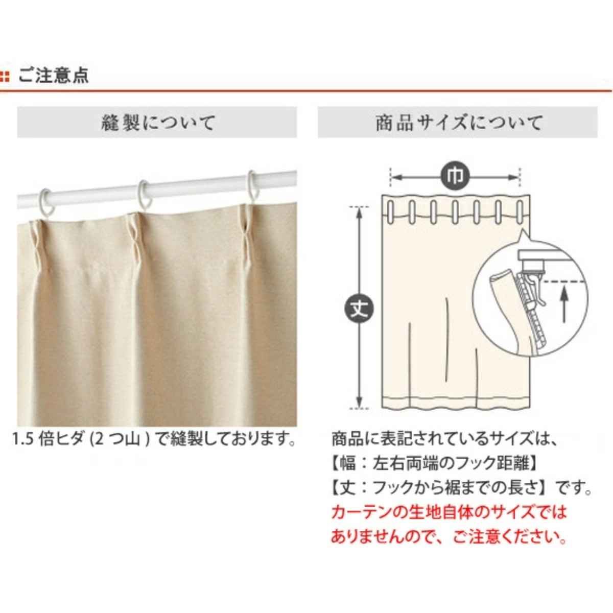 | 備考 | 75mm芯地1.5倍ヒダ リピート 縦:約 63.5 横:約 75(cm) ※商品名に表記されているサイズ(丈)はカーテンフックのレール取付け部分から測った長さを表記しています。 |