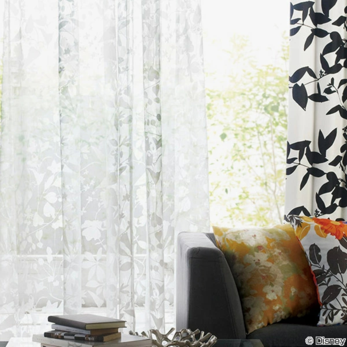 伸びやかで生き生きとした植物の中にミッキーや仲間たちが隠れた、遊び心いっぱいのボイルカーテンです。ボイル生地の糸は、通常のレースの糸よりも細い糸を使用しています。細い糸で織られていますが程よく透け感がありつつも、しっかりした生地です。プリントは柄を引き立てるオパールプリントで仕上げています。クラシックやモダンな雰囲気で子供だけではなく、大人も楽しめるディズニーデザインのカーテンです。