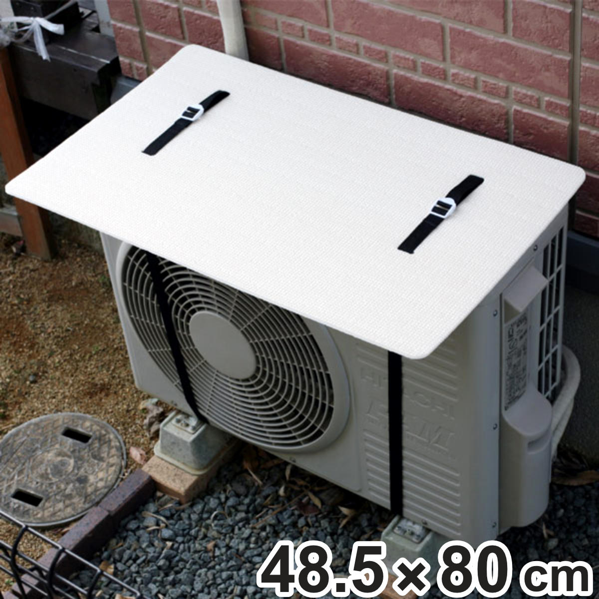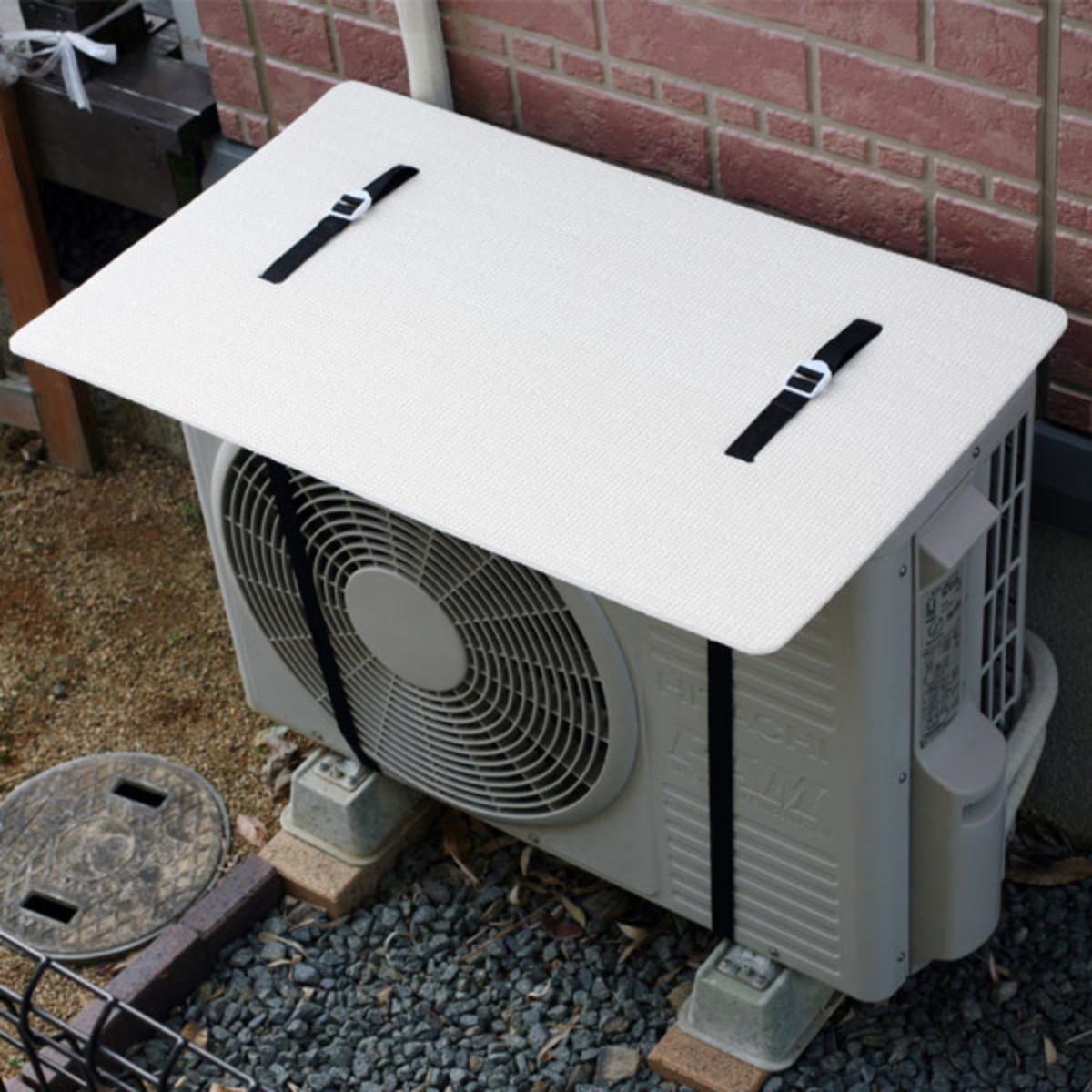 (1)ベルト穴から、端までの距離の長い方が全面になるようにエアコン室外機の上部に本品をおいてください。