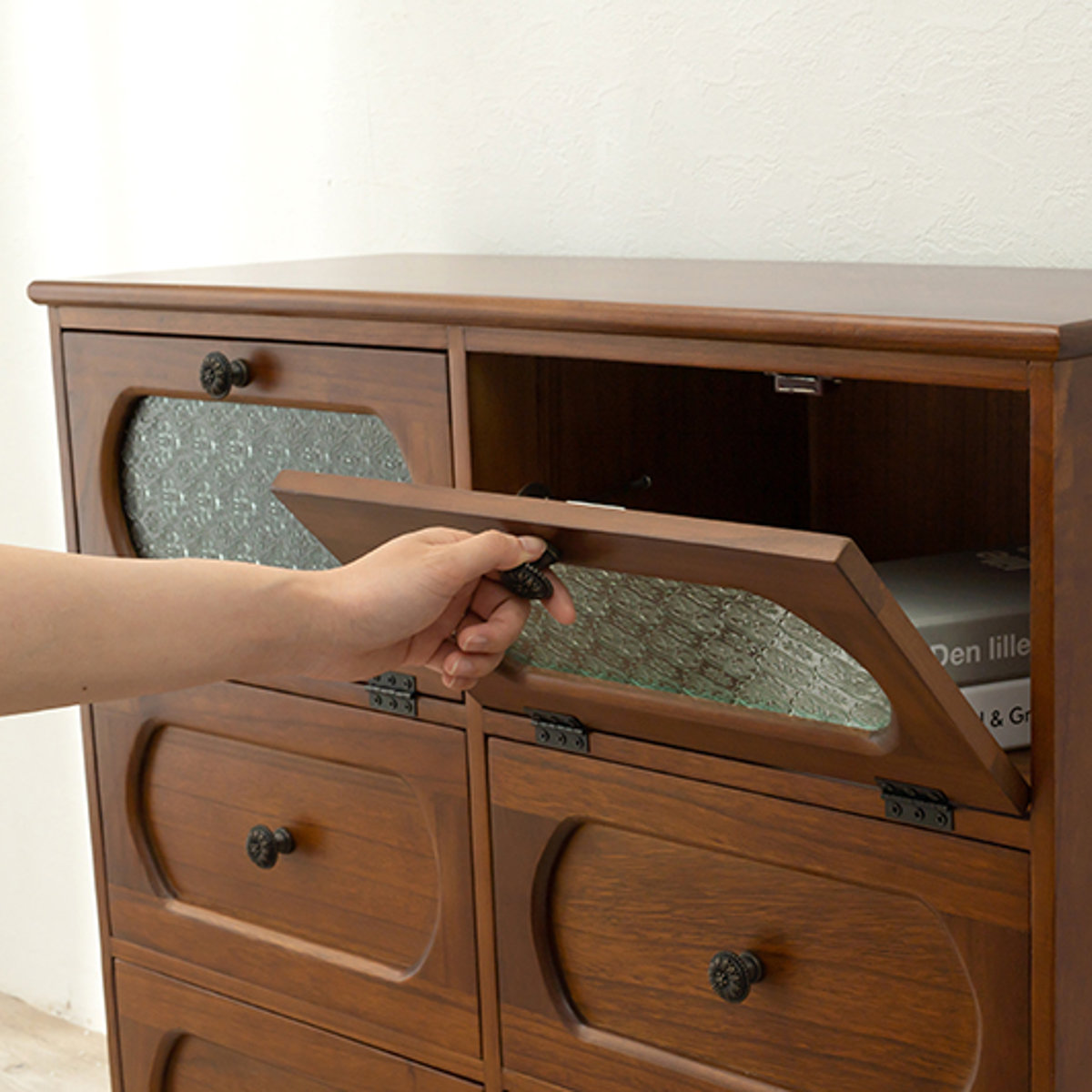ワイドチェスト 2段4杯 ガラス開き戸付 桐製 ビンテージ調 幅80cm ( 収納棚 フラップ扉 ヴィンテージ風 リビング収納 桐 天然木 完成品 収納 チェスト 棚 大正ロマン風 木製 レトロモダン ブラウン おしゃれ )
