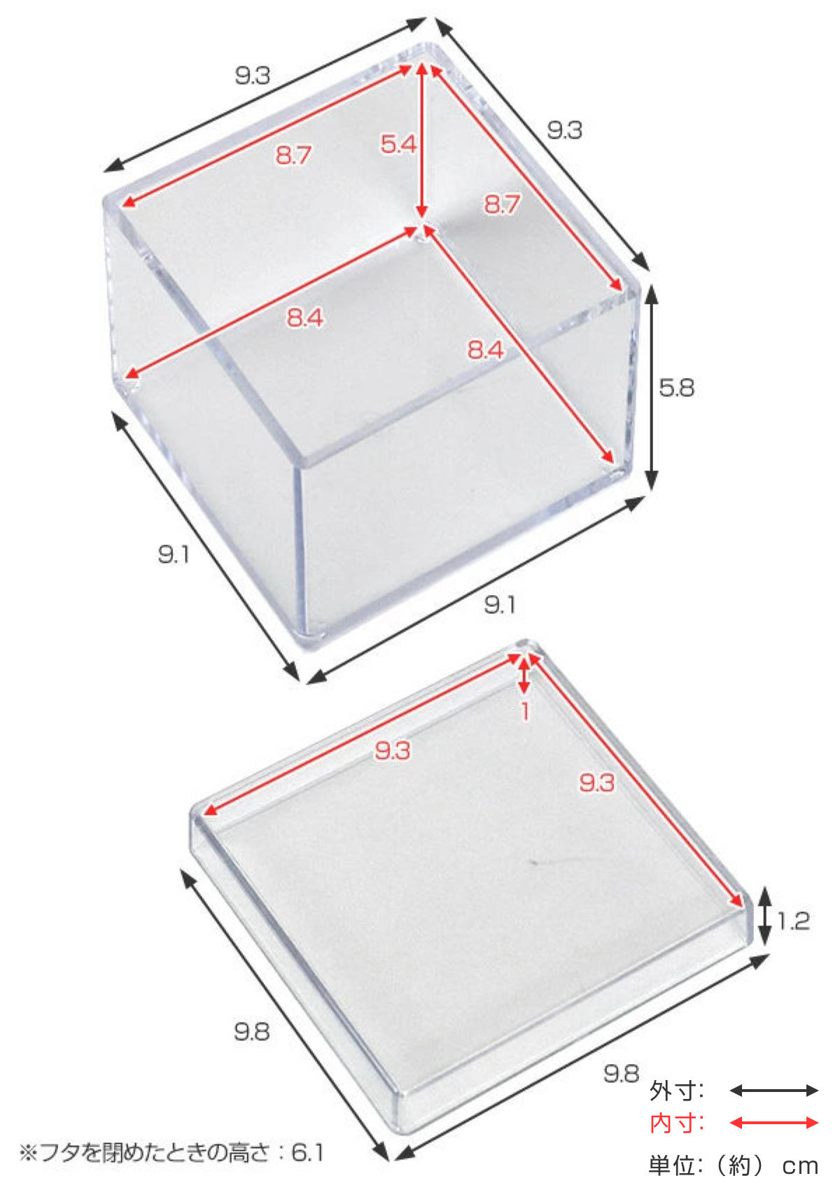 - 外寸:約幅9.8×奥行9.8×高さ6.1cm