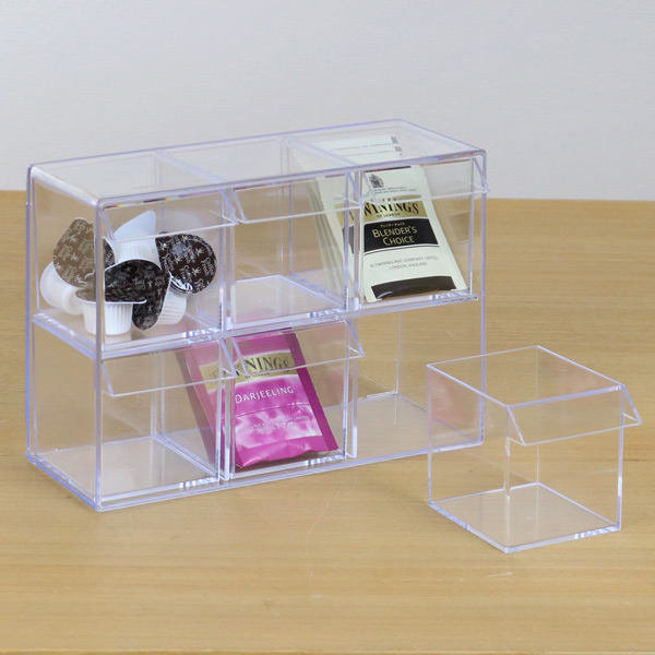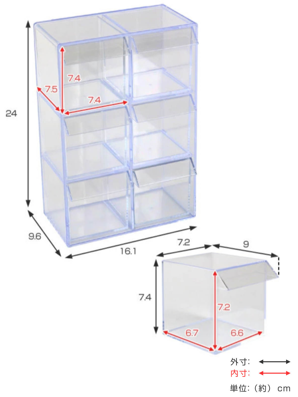 | サイズ | 外寸:約 幅24×奥行9.6×高さ16.1(cm) 内寸:約 幅6.6×奥行6.7×高さ7.2(cm) ※内寸は引出し1個あたりのサイズ |