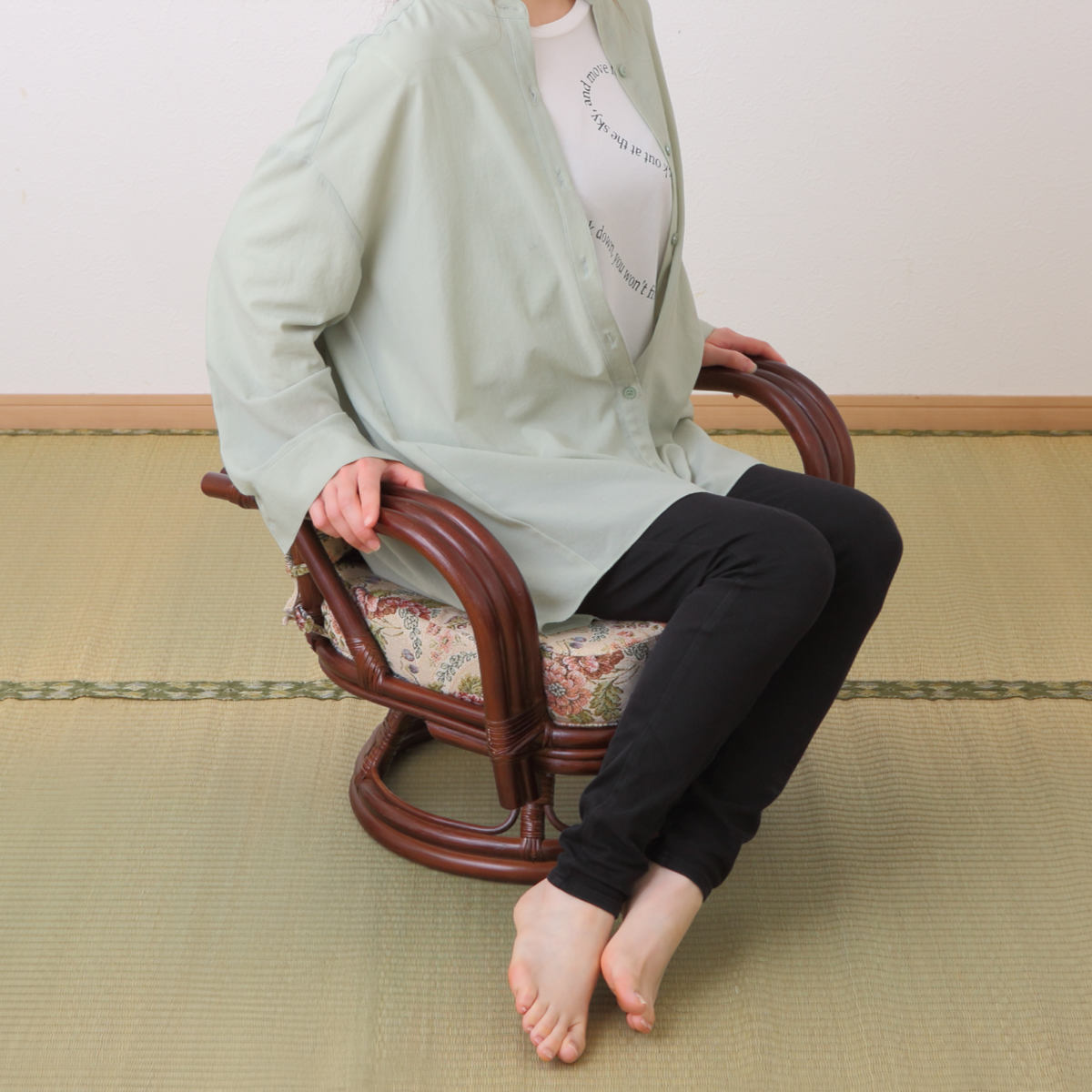 天然素材、ラタンを贅沢に使用した回転座椅子です。座卓でも使いやすい座面高26cmで、足を伸ばしてゆったりと座っていただけます。ラタン製の座椅子は通気性がよく年中快適。天然素材の風合いと温もりが、くつろぐ時間にぴったりです。