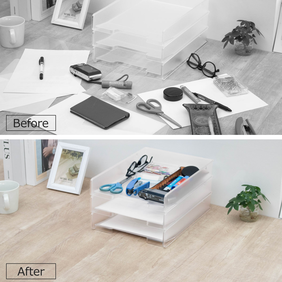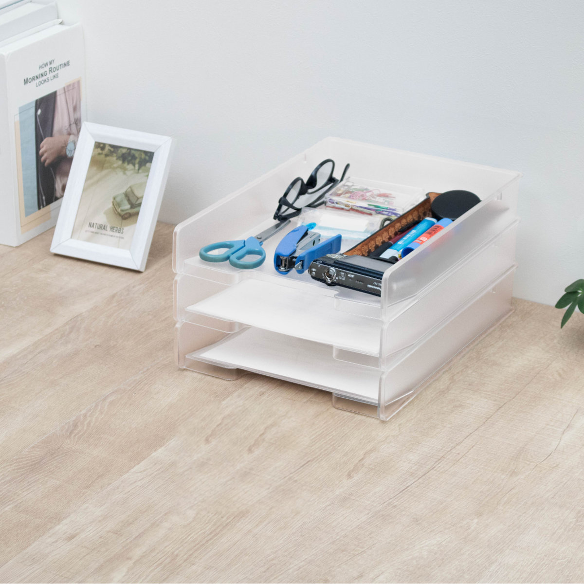 A4サイズ対応のファイルトレーは、書類やプリントの整理整頓に便利です。積み重ねて使えるため、省スペースで収納量を増やせます。デスク周りの文具や小物類もまとめて収納でき、作業スペースをすっきり整えられます。