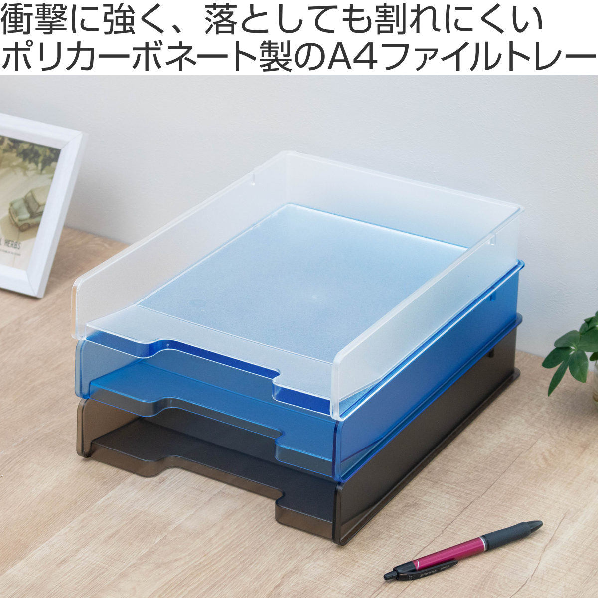 ファイルトレーは、プラスチックの中でも耐衝撃性に優れたポリカーボネート製です。落としても割れにくく、安心してお使いいただけます。