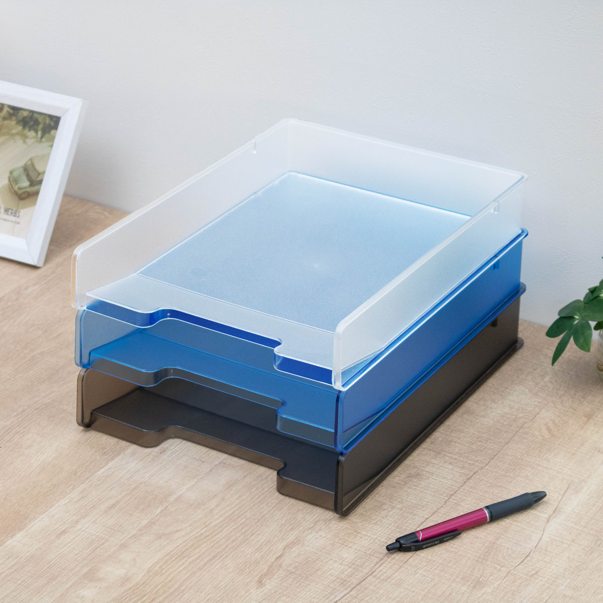 ファイルトレーは3色展開。カラーごとに書類を分類して収納することで、何がどこにあるか把握しやすくなります。定位置を決めて整理できるため、書類の紛失や探す手間を減らすことにもつながります。