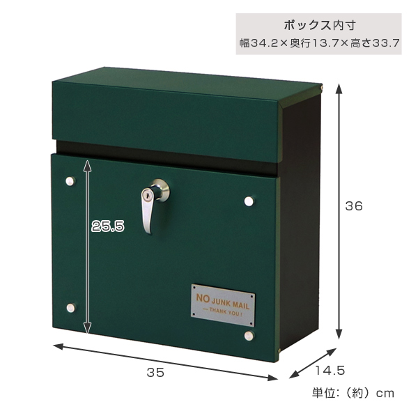 | サイズ | 本体:約 幅35×奥行14.5×高さ36(cm) 投函口:約 幅34.4×高さ3.5(cm) 取出口:約 幅25.5×高さ35(cm) ボックス内寸:約 幅34.2×奥行13×高さ33.7(cm) 重量:約2.5kg |
