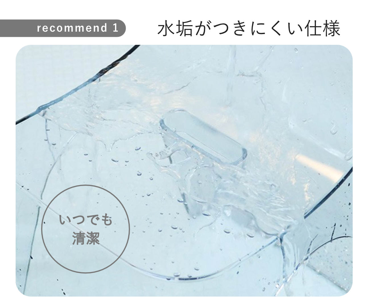 水が溜まるようなムダな凹凸がなく、水垢がつきにくいです。 表面はカビ防止加工を施した鏡面仕上げ。 汚れの付着を防止します。
