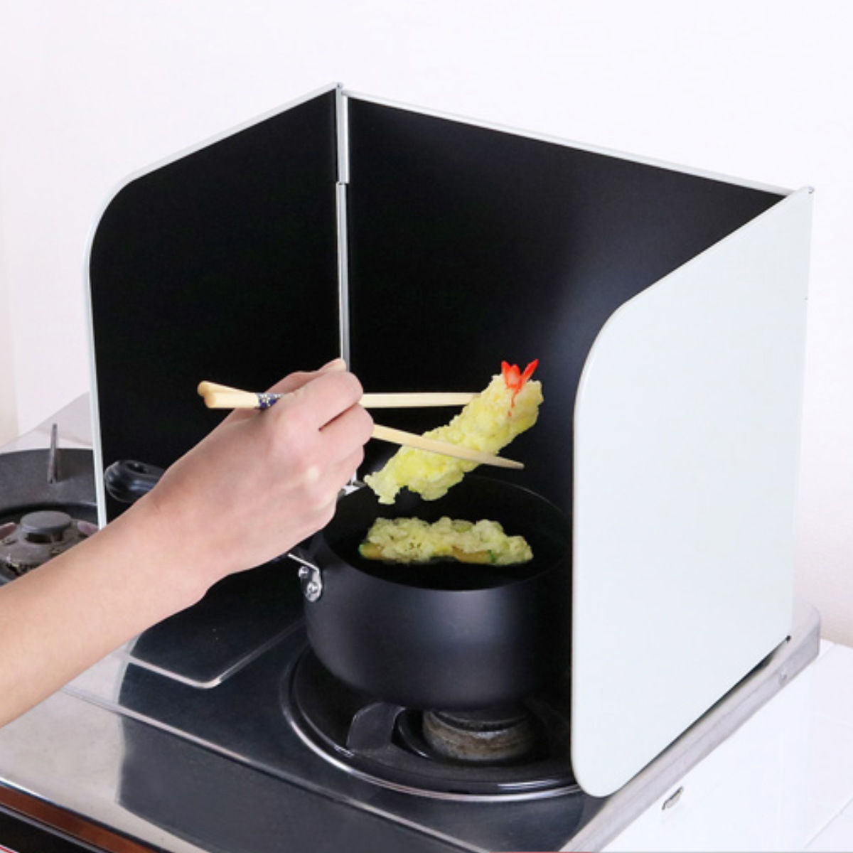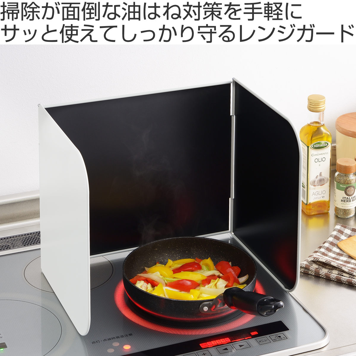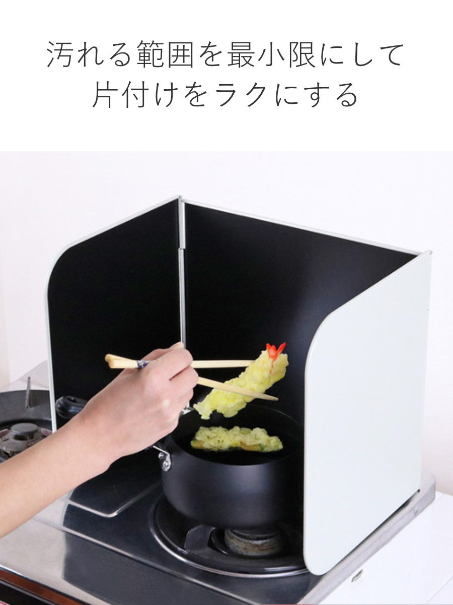 フライパンや鍋のそばに立てるだけの簡単設置で手軽に使えます。3面タイプのレンジガードなので両サイドと壁側、3方向への油はねをしっかり防ぎます。