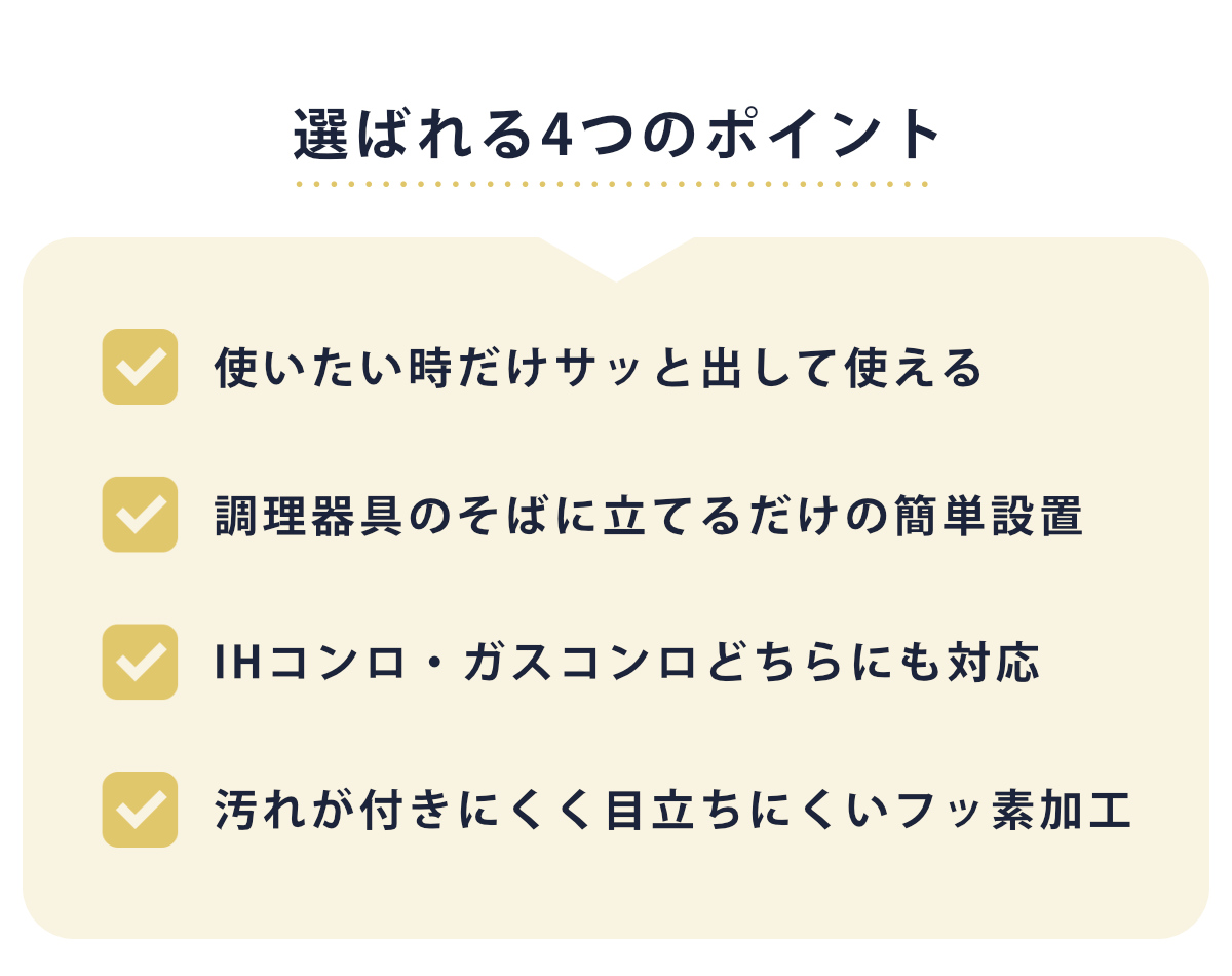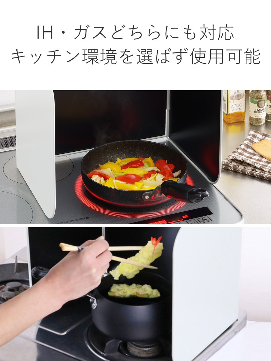 IHコンロにもガスコンロにも対応。ご家庭のキッチン環境を選ばず使用でき、安定感のある設計で油はねや汚れをしっかりガード。毎日の調理を快適にサポートします。