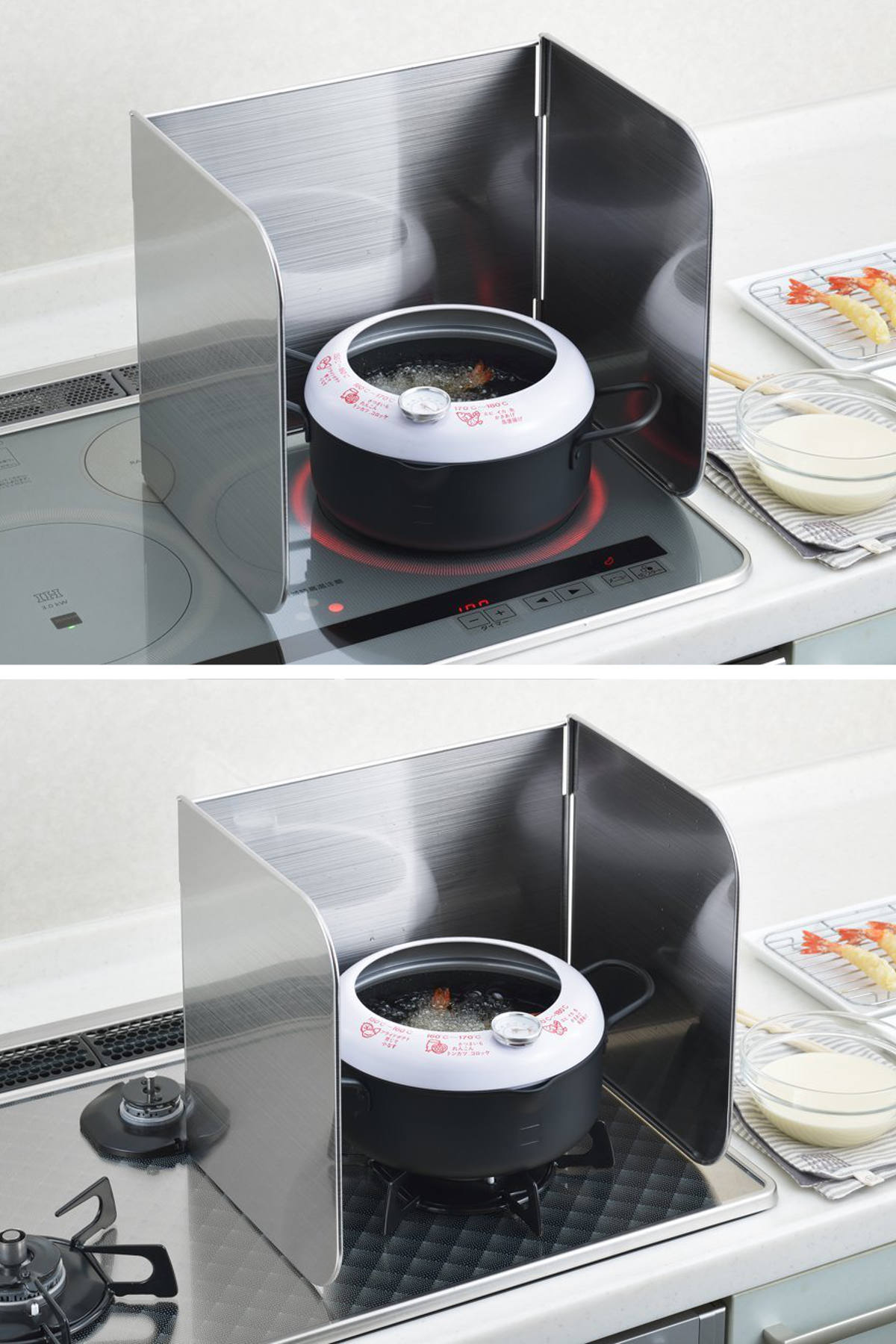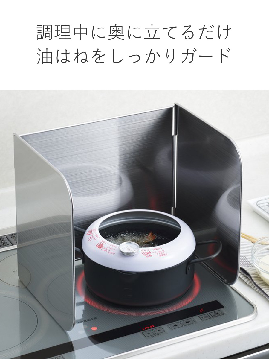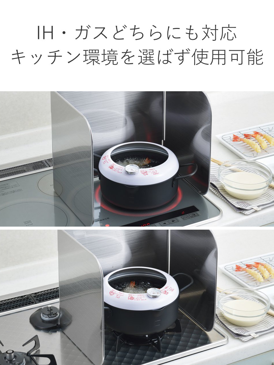 IHコンロにもガスコンロにも対応。ご家庭のキッチン環境を選ばず使用でき、安定感のある設計で油はねや汚れをしっかりガード。毎日の調理を快適にサポートします。