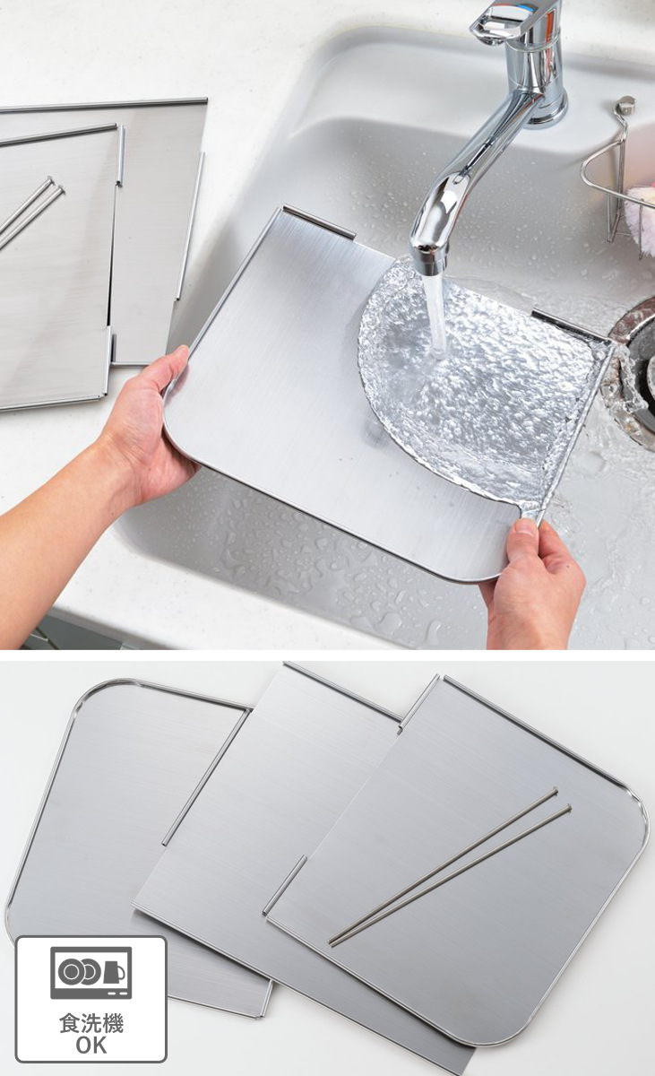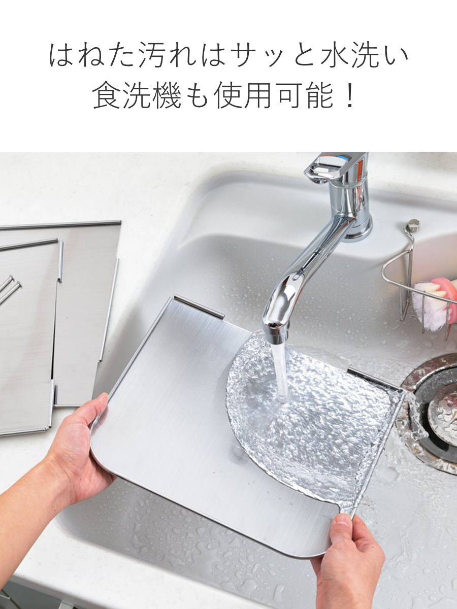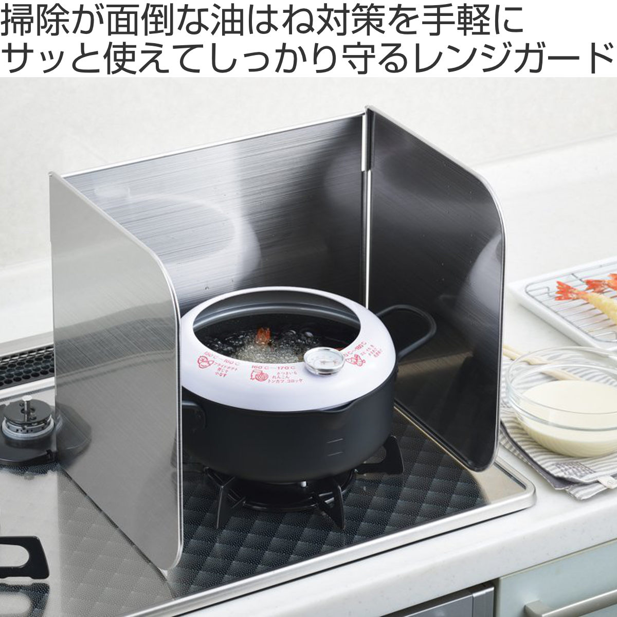 フライパンや鍋のそばに立てるだけの簡単設置で手軽に使えます。3面タイプのレンジガードなので両サイドと壁側、3方向への油はねをしっかり防ぎます。