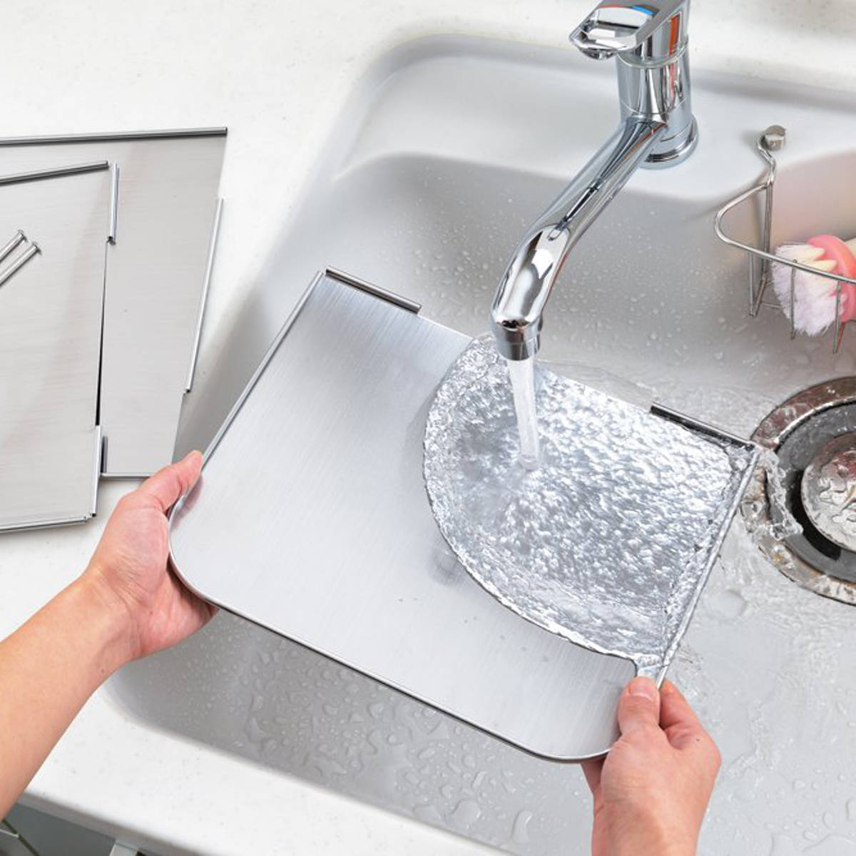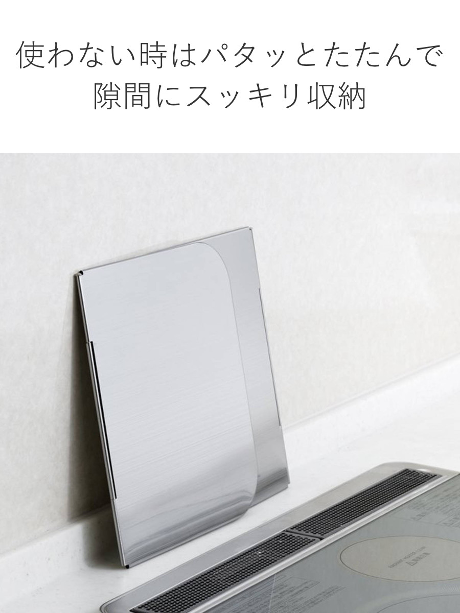 使わないときは折りたたんでコンパクトに。コンロ横やシンク下、棚の隙間などにすっきり収納できます。持ち運びもしやすく、BBQなどのアウトドアでも活躍。油はね対策や風除けとしても便利に使えます。