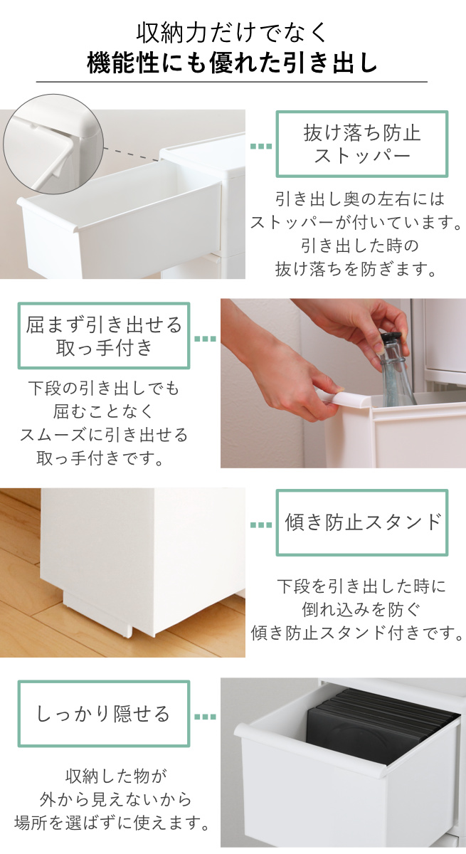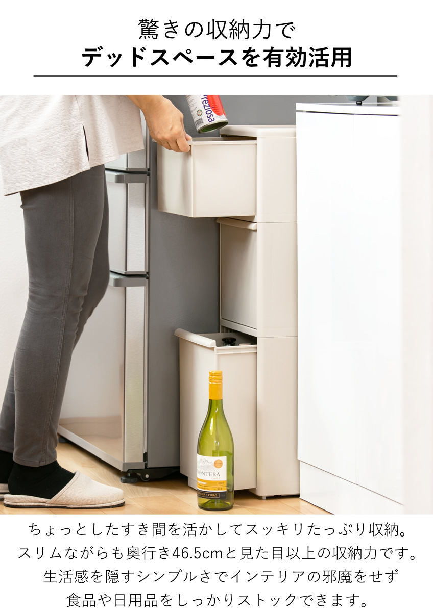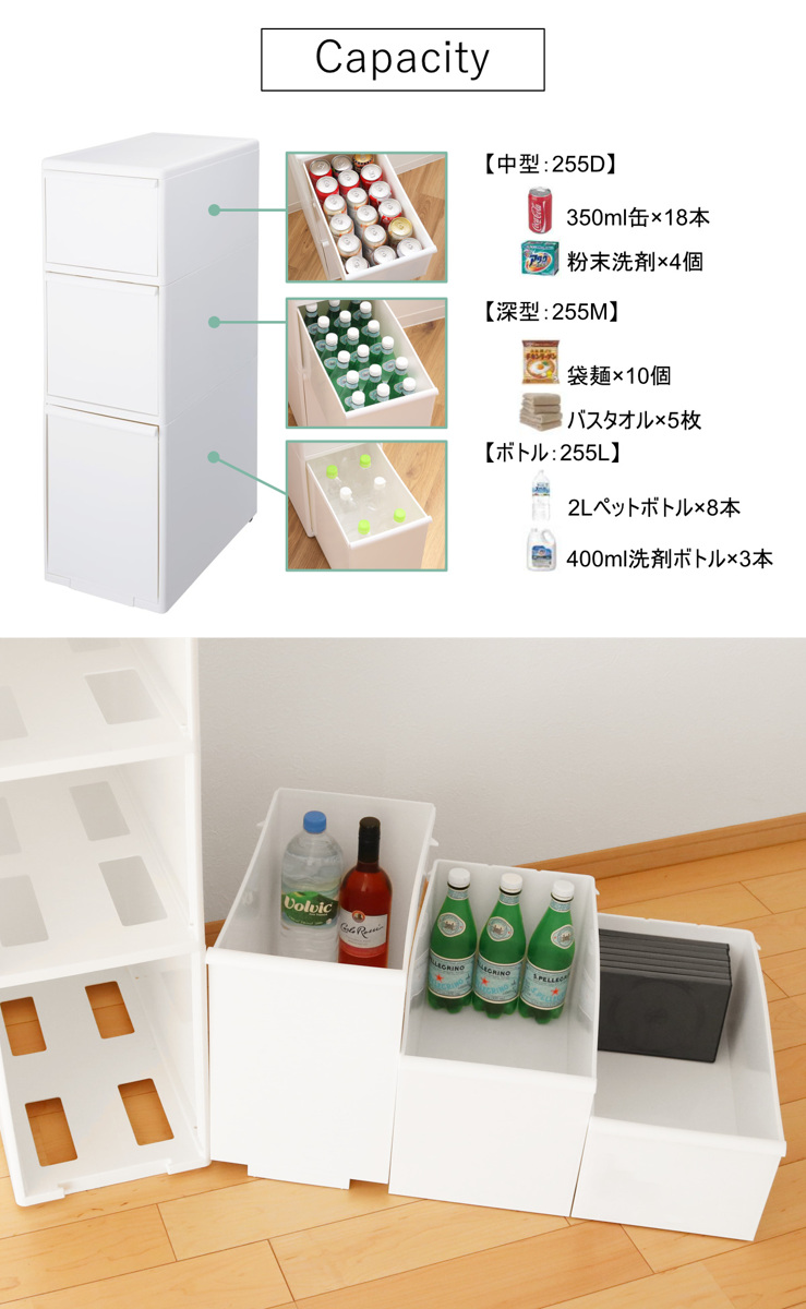 | 引き出し1段あたり耐荷重 | 中型・深型:約 5kg ボトル:約 14kg |