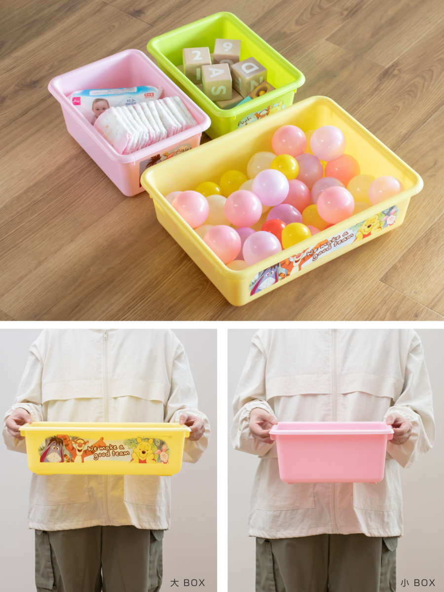 収納ボックスは大と小の2種類あり、小物から大きめの物までたっぷり収納することができます。ボックスごと引き出すことができるので、衣類や大きめの物も入れやすいです。軽くて丈夫なプラスチック製なので、お子様でも持ち運ぶことができます。