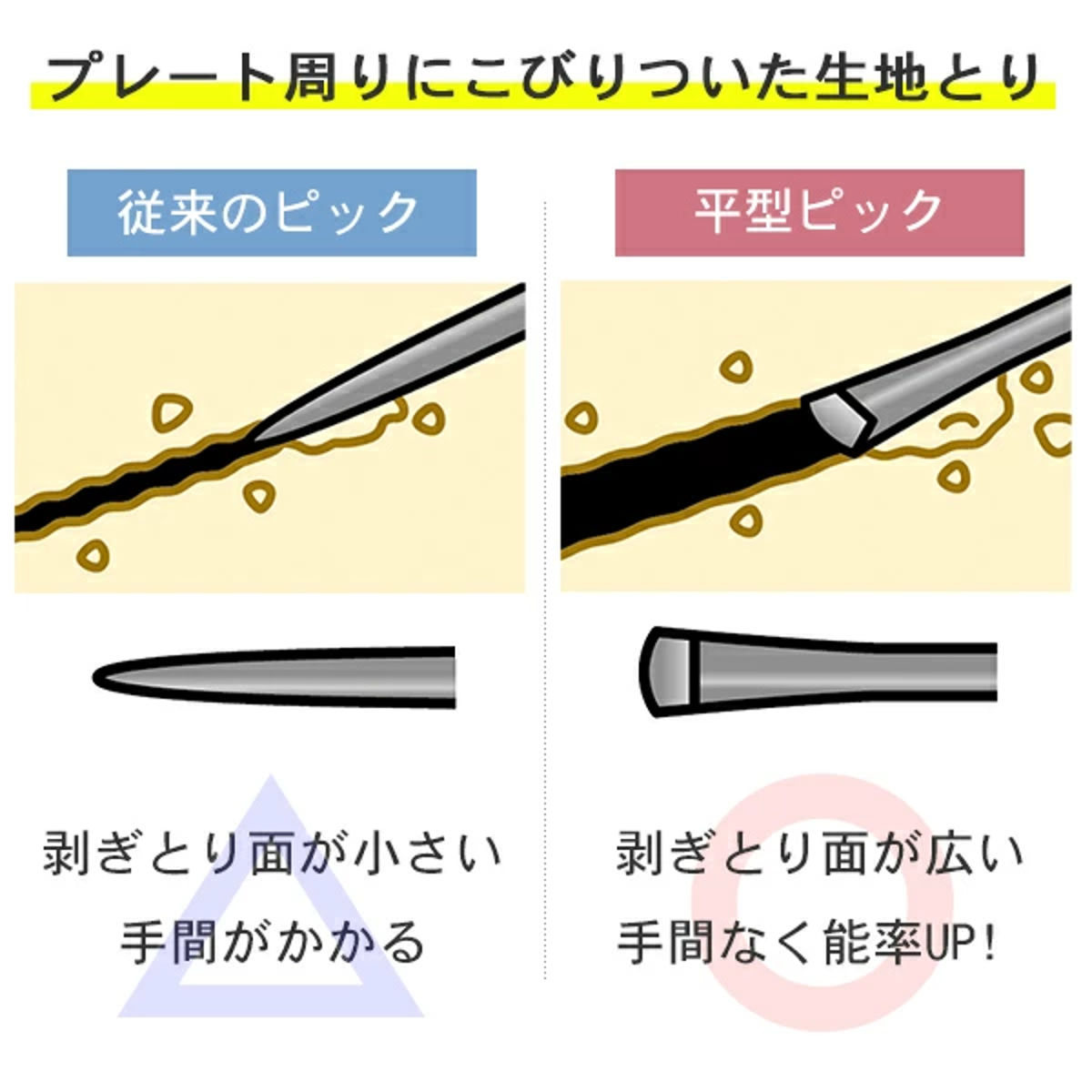 先端が平型で面が広く、プレート周りの生地もきれいに剥がせます。