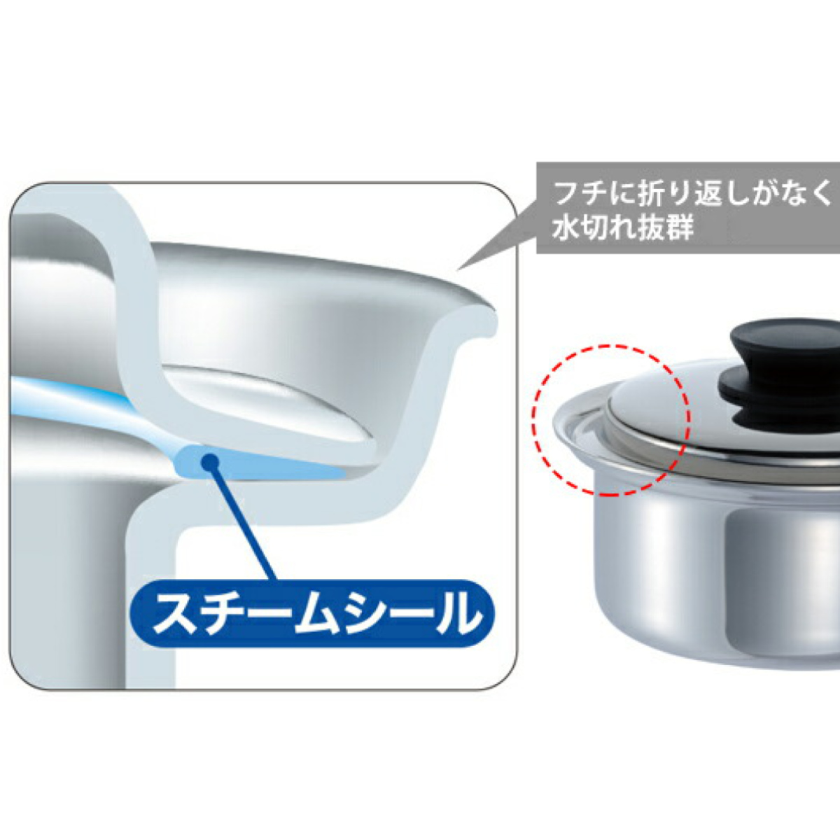 | 材質 | 本体:3層クラッド材(内側:ステンレス鋼、中心:アルミニウム合金、外側:ステンレス鋼) 本体内面:ラセン研磨仕上げ 本体外面:ミラー研磨仕上げ 蓋:ステンレス鋼 ハンドル:フェノール樹脂 蓋ツマミ:フェノール樹脂 |
