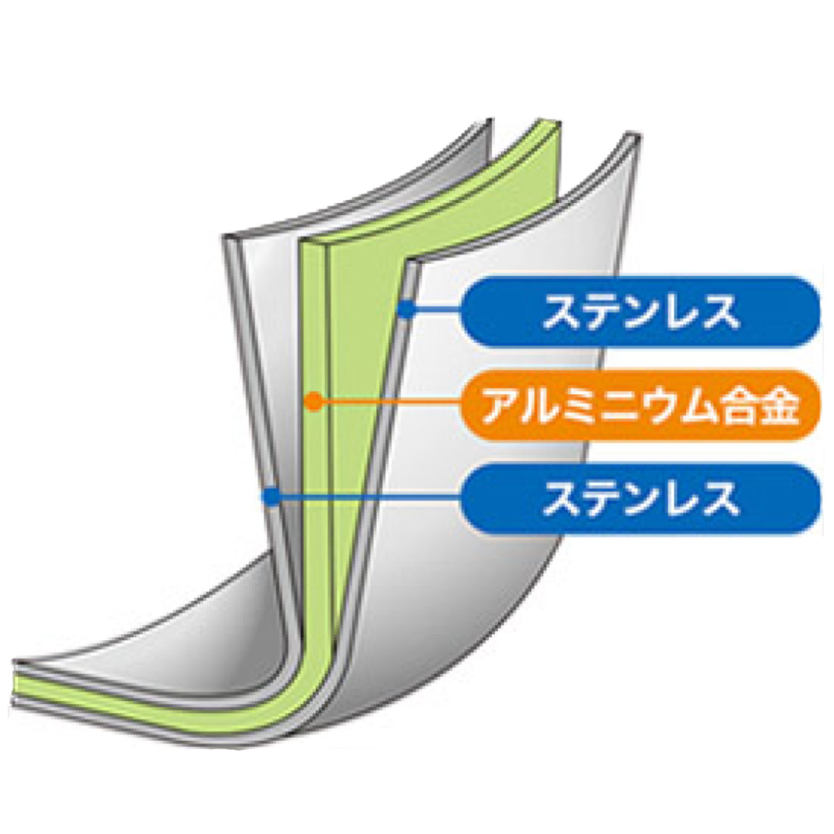 ●熱伝導の良いアルミニウムを、ステンレスで挟み込んだ全面3層構造です。