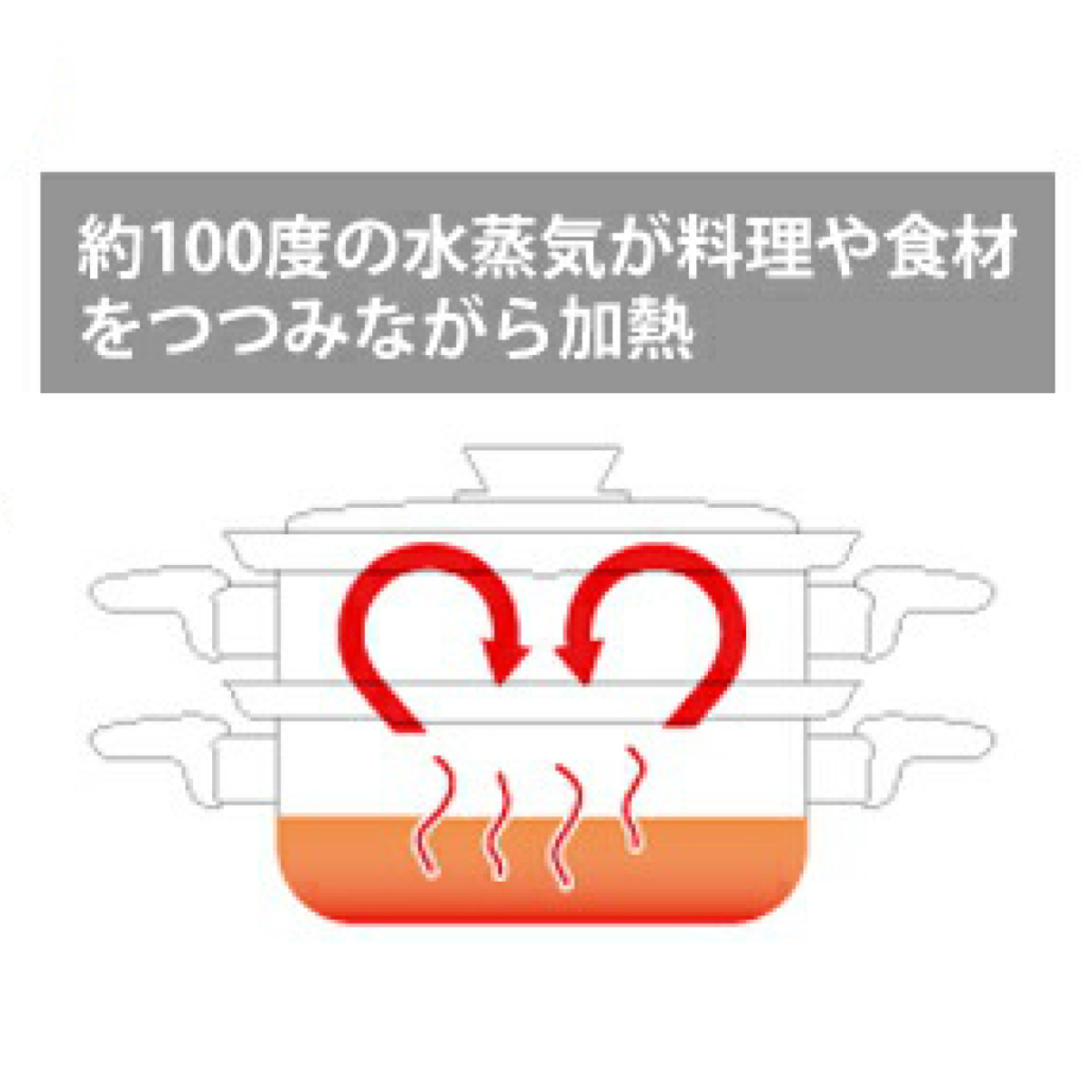 ●約100度の水蒸気で包み込むように加熱することで、食材をしっとり、ふっくら、やわらかく仕上げます。