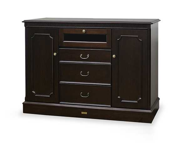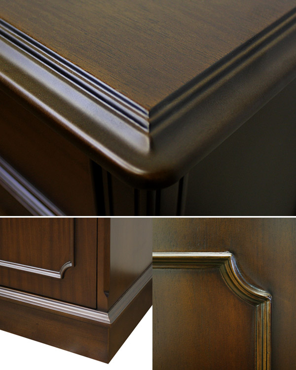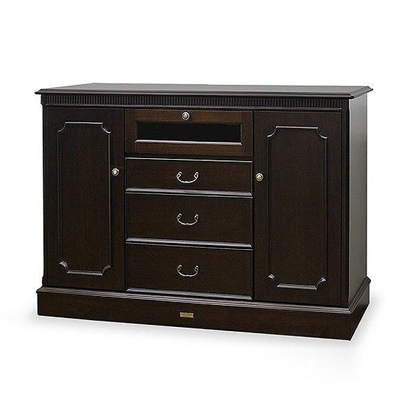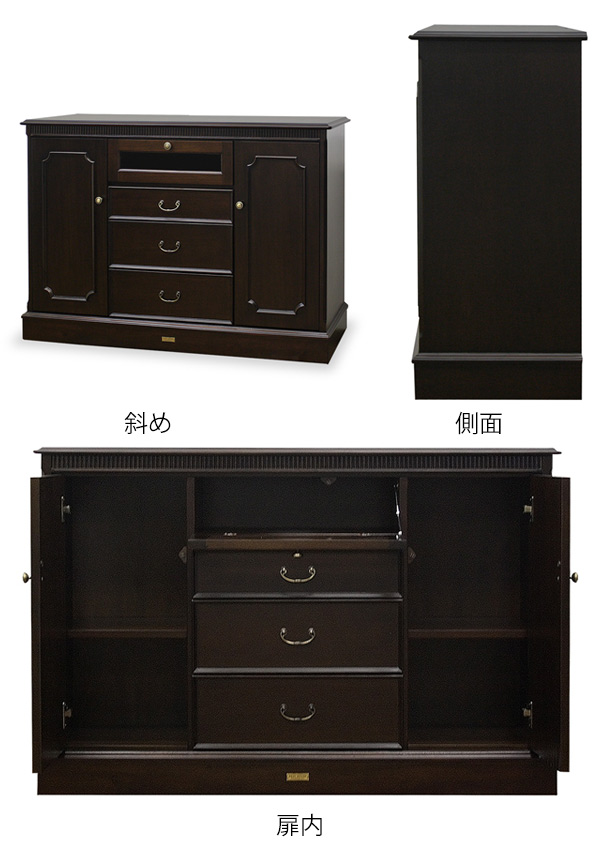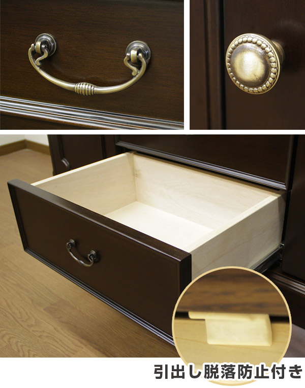 引出しのハンドルや、扉のつまみなどアンティーク感が漂う雰囲気を演出しています。引出しの中は、ベニヤの色むらをなくすために、漂白し清潔感をもたせてあります。また、引出し脱落防止が付いています。