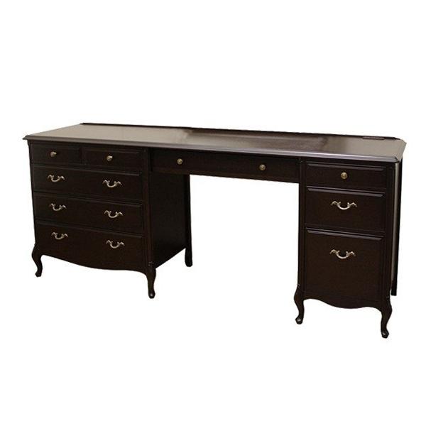 贅沢なマホガニー材を使用したヨーロピアンクラシック調のワイドデスクです。気品漂うエレガントな雰囲気で、どんなお部屋にも合わせやすく、日々愛用できるシンプルなデザインです。本格的なデスクワークまでできるワイドサイズの天板です。
