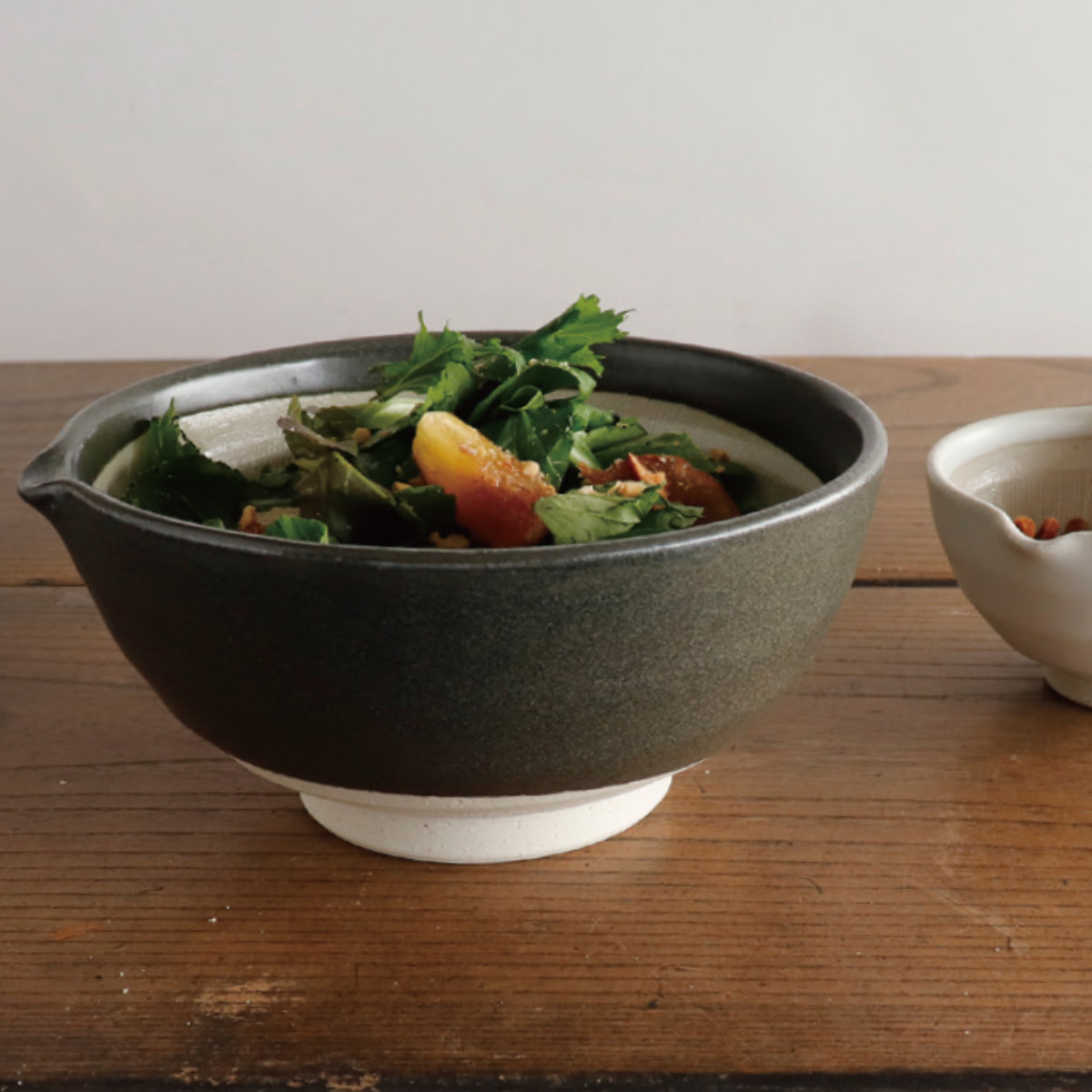 すったゴマや山芋などを他のうつわに注ぎやすい片口すり鉢です。作ったドレッシングやソースを注ぐときにも便利です。大きなサイズなので、たっぷりすりたいときに役立ちます。