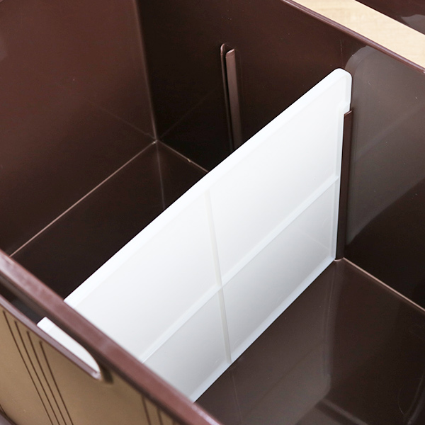 溝に合わせて移動できる仕切り板付きです。仕切り板があることで、整理整頓しやすく倒れやすいアイテムも安定して収納できます。